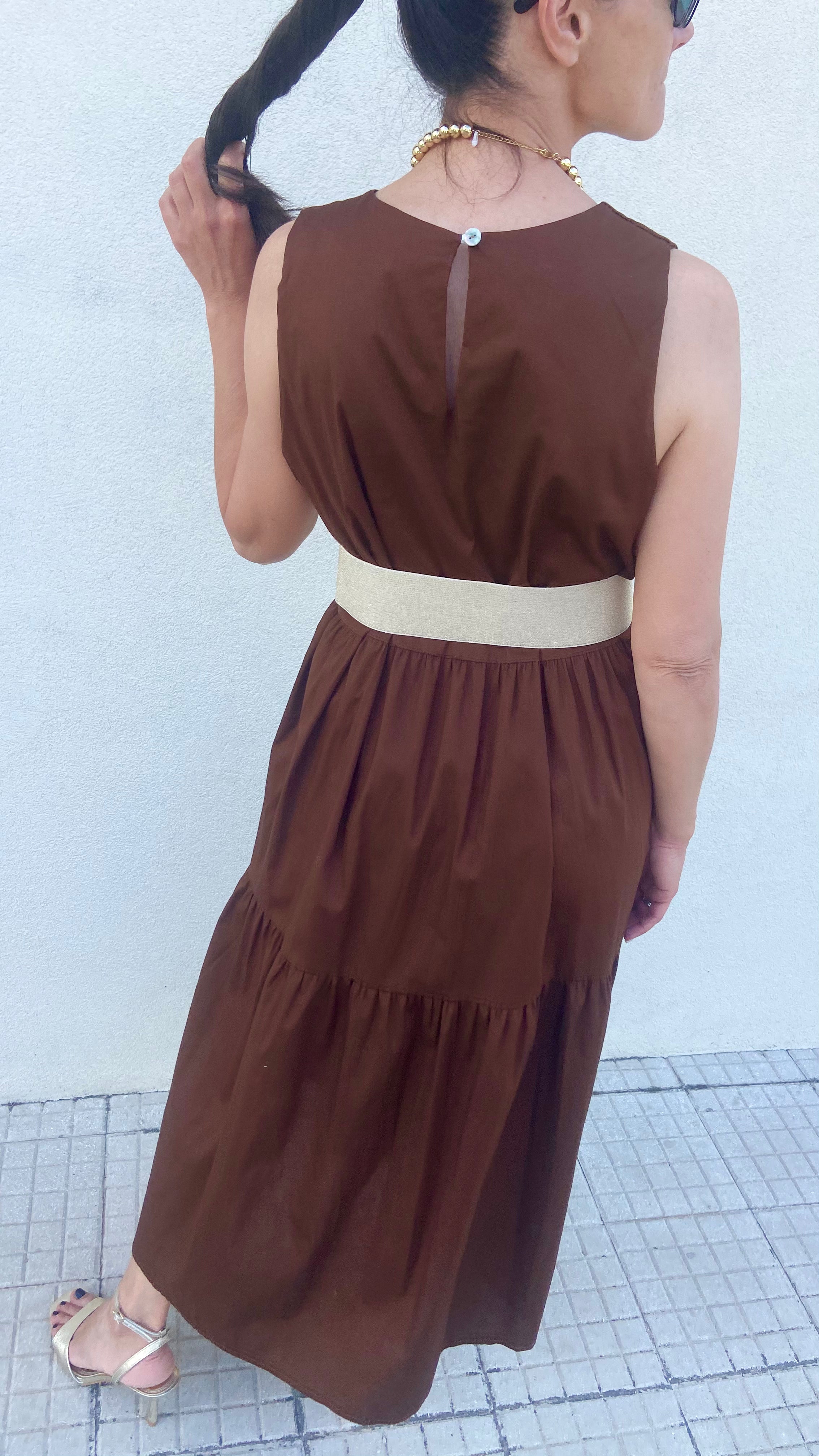 ABITO IN COTONE A BALZE  MODELLO A GIROCOLLO  SPALLINA LARGHA ALLACCIATURA A GOCCIA DIETRO ALLA SCHIENA LUNGHEZZA ALLA CAVIGLIA  TASCHE LATERALI  TESSUTO COTONE  MIS UNICA VESTIBILITA' AMPIA  COLORE MARRONE...