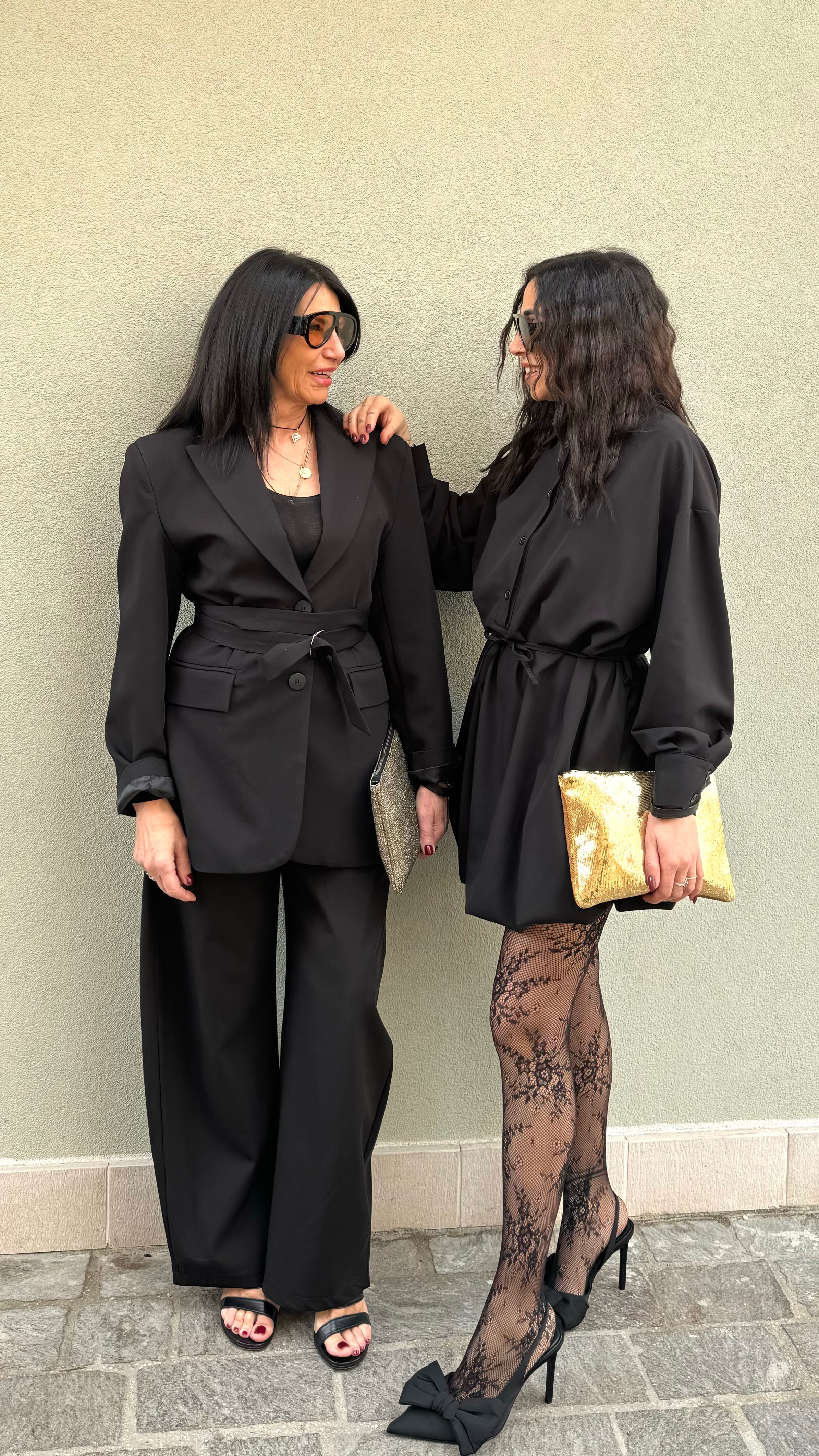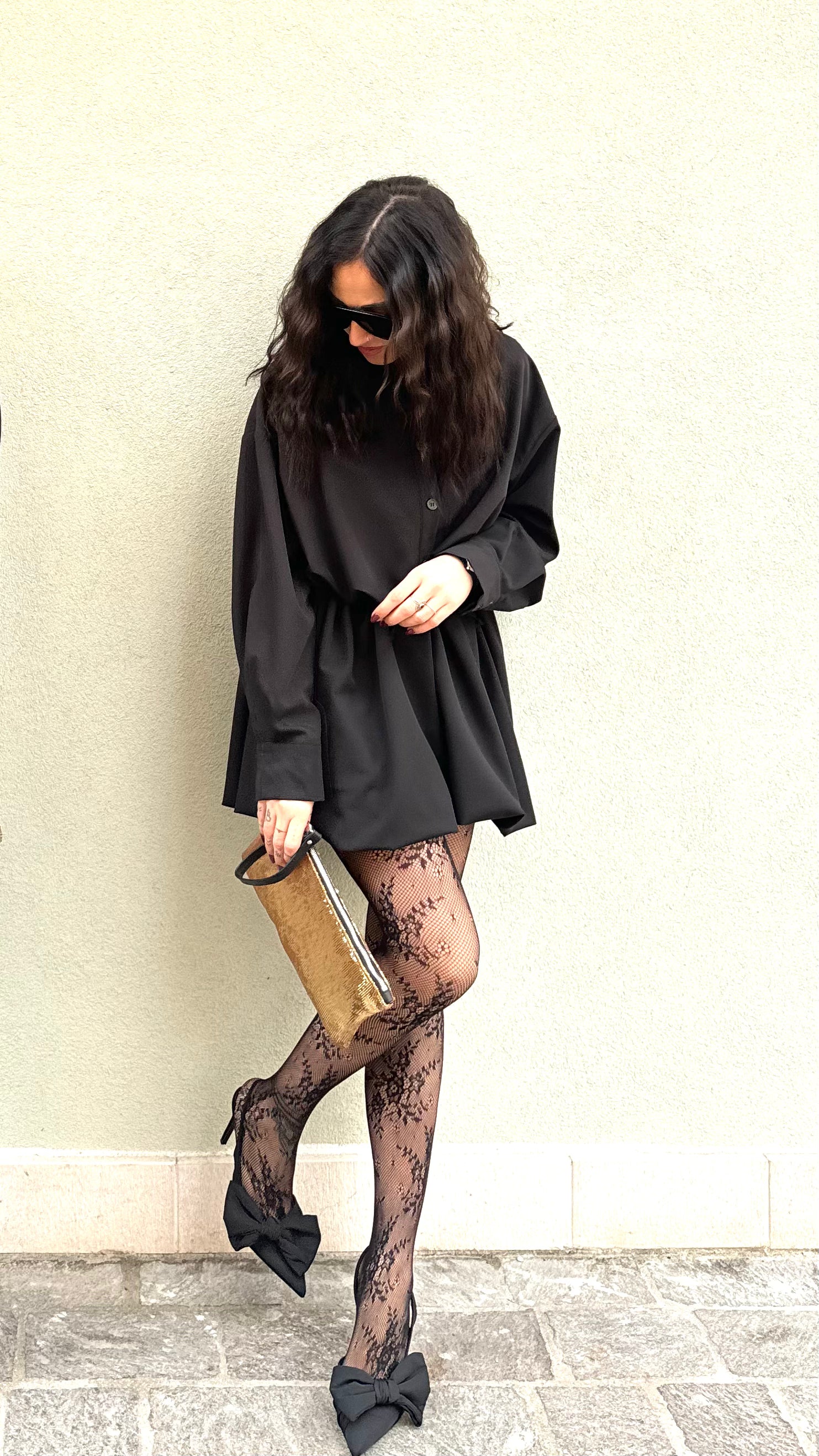 ABITO MODELLO CAMICIA  A PALLONCINO  COLORE NERO  TESSUTO CAMICIA  CINTA FINA IN VITA  MIS SPALLA  55 CM FIANCO 55 CM LUNGO 70 CM  MIS UNICA  VESTIBILITA ' NORMALE  LA MODELLA...
