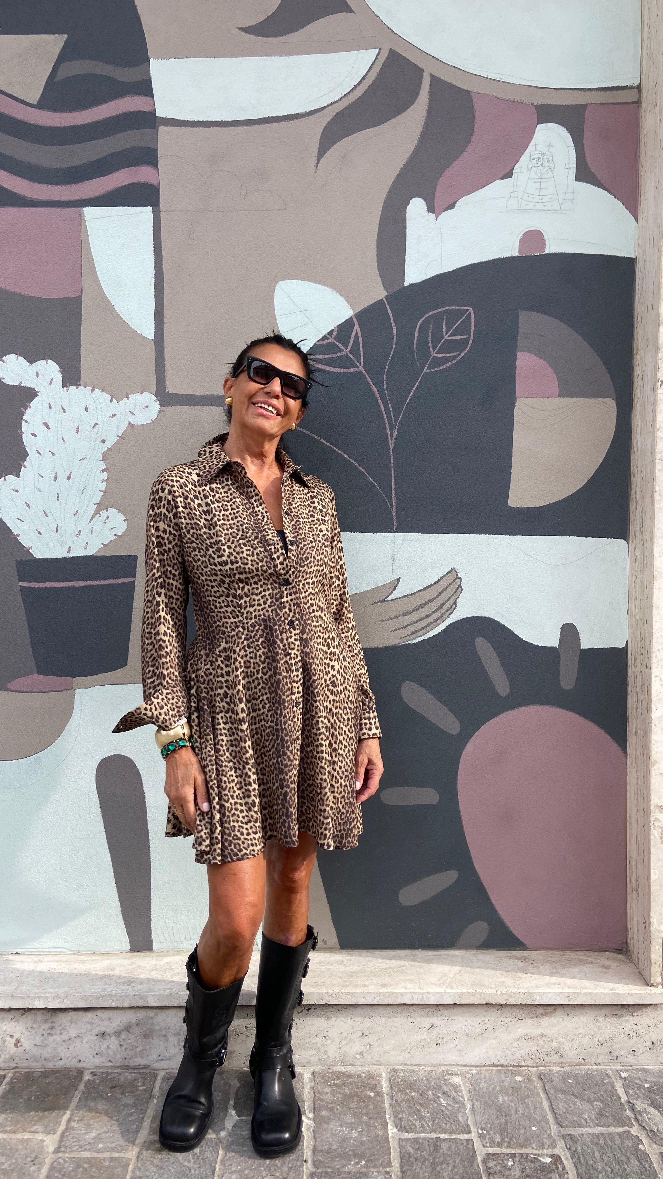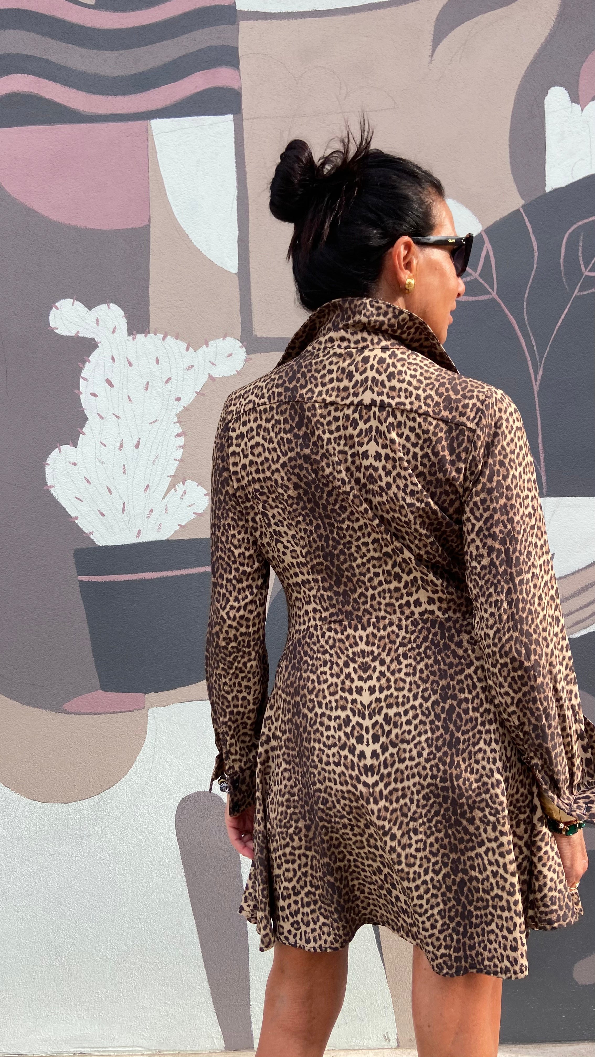 ABITO CHEMISIERE  TAGLIO A TRAPEZIO  MANICHE LUNGHE  FANTASIA ANIMALIER  TESSUTO VISCOSA  E ELASTENE MIS UNICA VESTE FINO AD UNA 46  MODELLA IN FOTO VESTE UNA 42 ALTEZZA 1,70 NUOVI ARRIVI ...