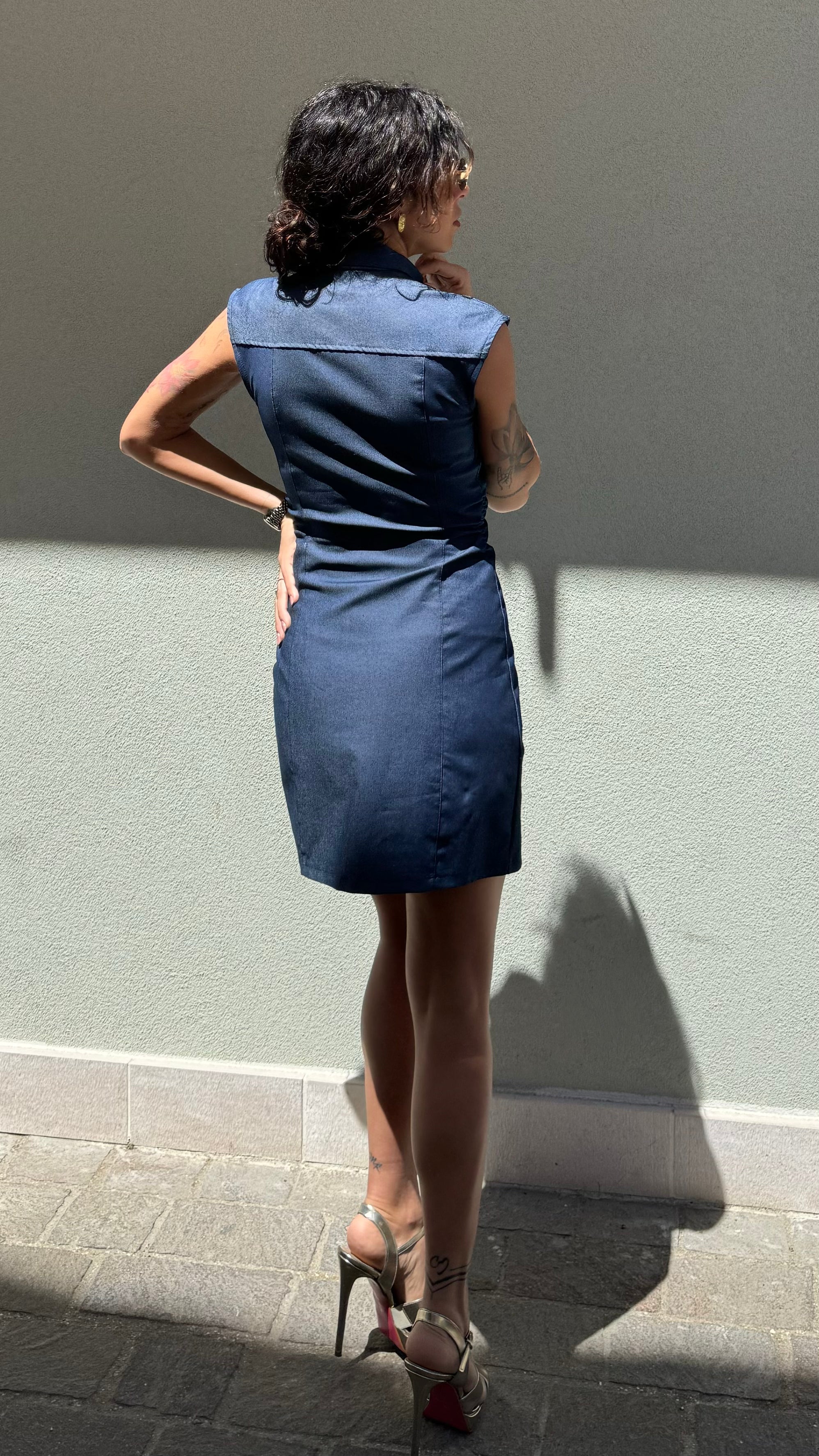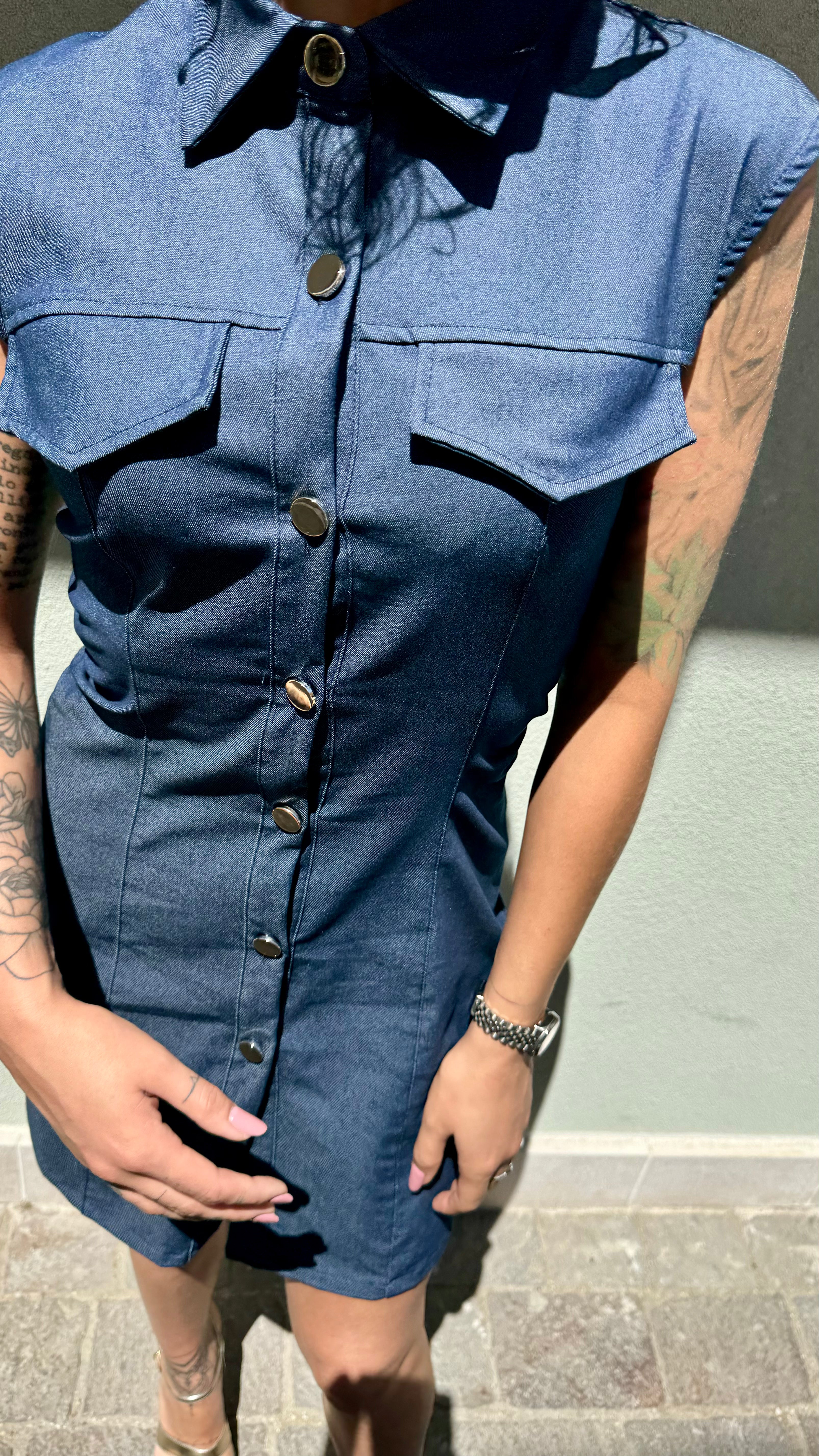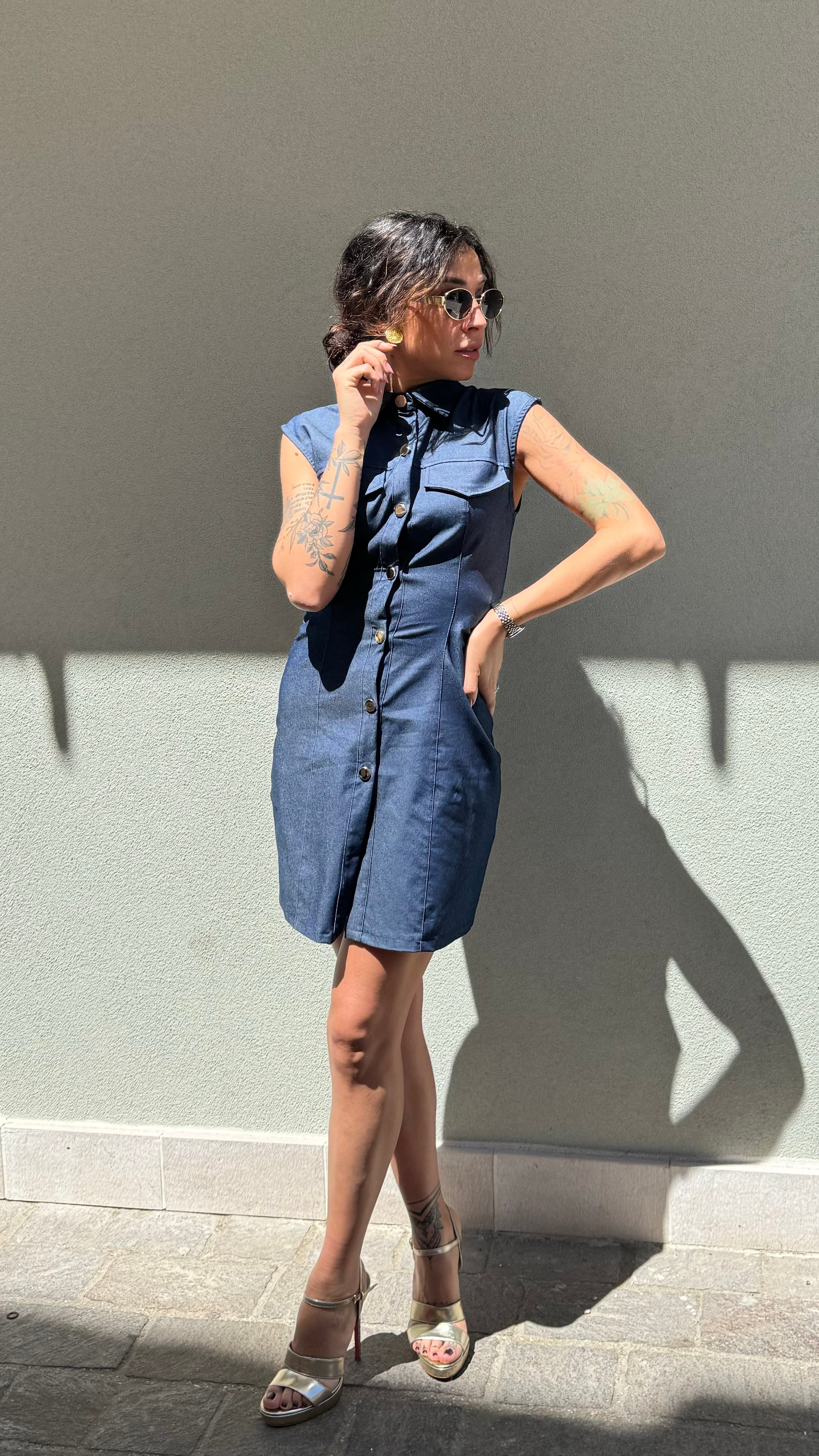 ABITINO IN JEANS  MODELLO CHEMISIERE  JEANS LEGGERISSIMO ELASTICIZZATO  FINTE TASCHE DAVANTI  BOTTONI COLOR ORO  ELASTICO AI LATI MIS UNICA VESTIBILITA' NORMALE  MIS LUNGHEZZA 80 CM SPALLA 43 CM  LA MODELLA...