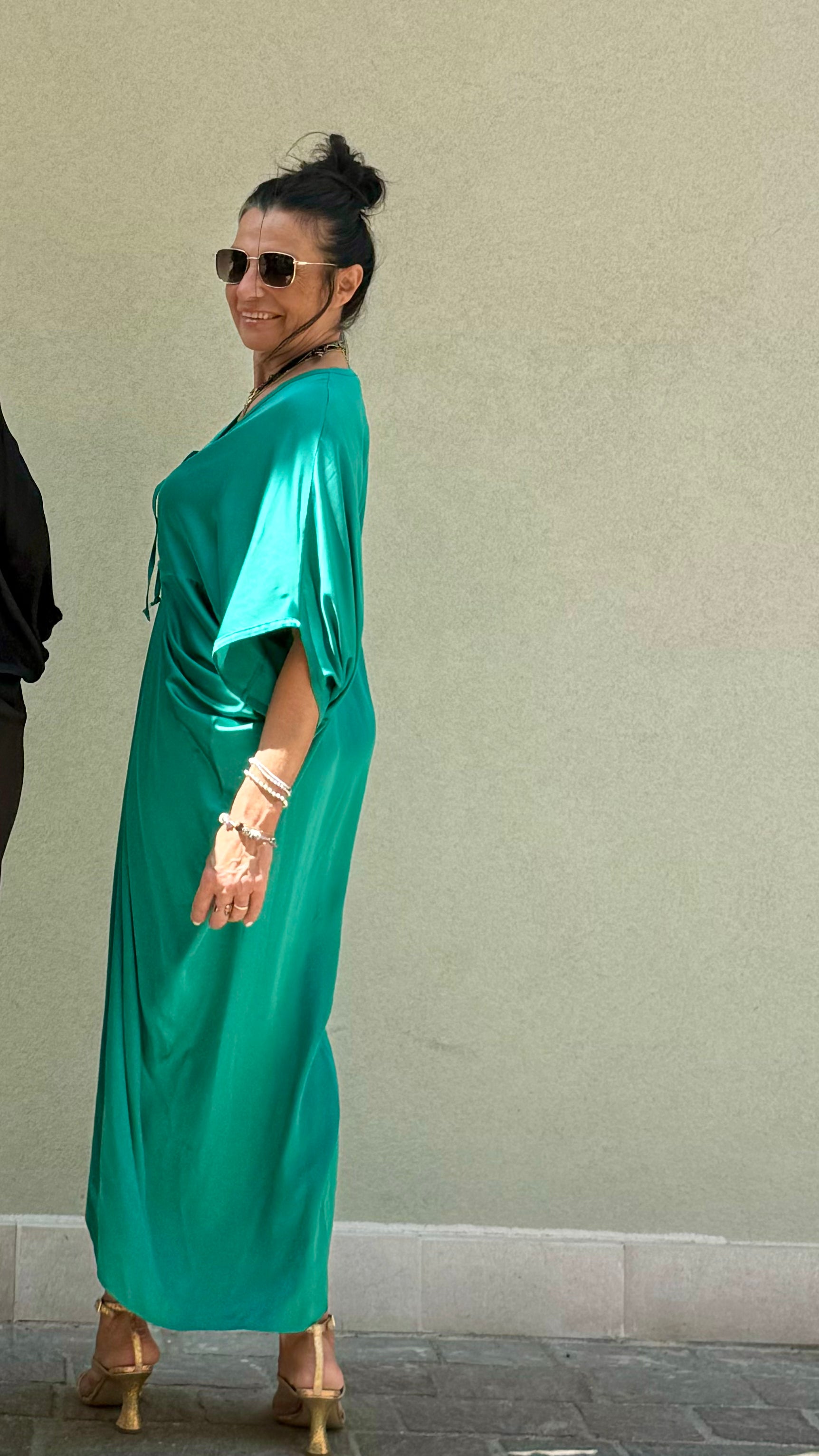 ABITO LUNGO CON DRAPPEGGIO  DETTAGLIO LACCI DAVANTI  MANICHE LUNGHE A PIPISTRELLO  SCOLLATURA A V  VESTIBILITA' MORBIDA MIS UNICA MODELLA IN FOTO ALTA 1,68 VESTE UNA 42/44 NUOVI ARRIVI