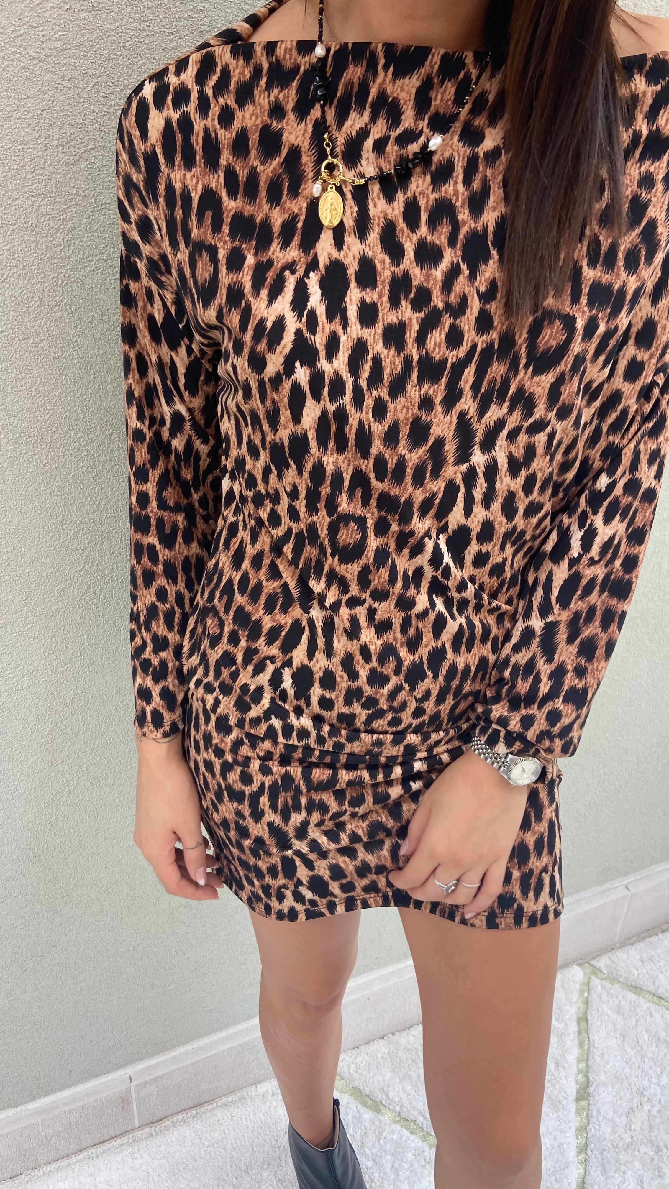 ABITO MACULATO  SCOLLO A BARCA  MANICA LUNGA  TESSUTO VISCOSA ELASTENE  MIS UNICA  MODELLA VESTE UNA 42  L'ABITO VESTE DALLA 40V ALLA 46