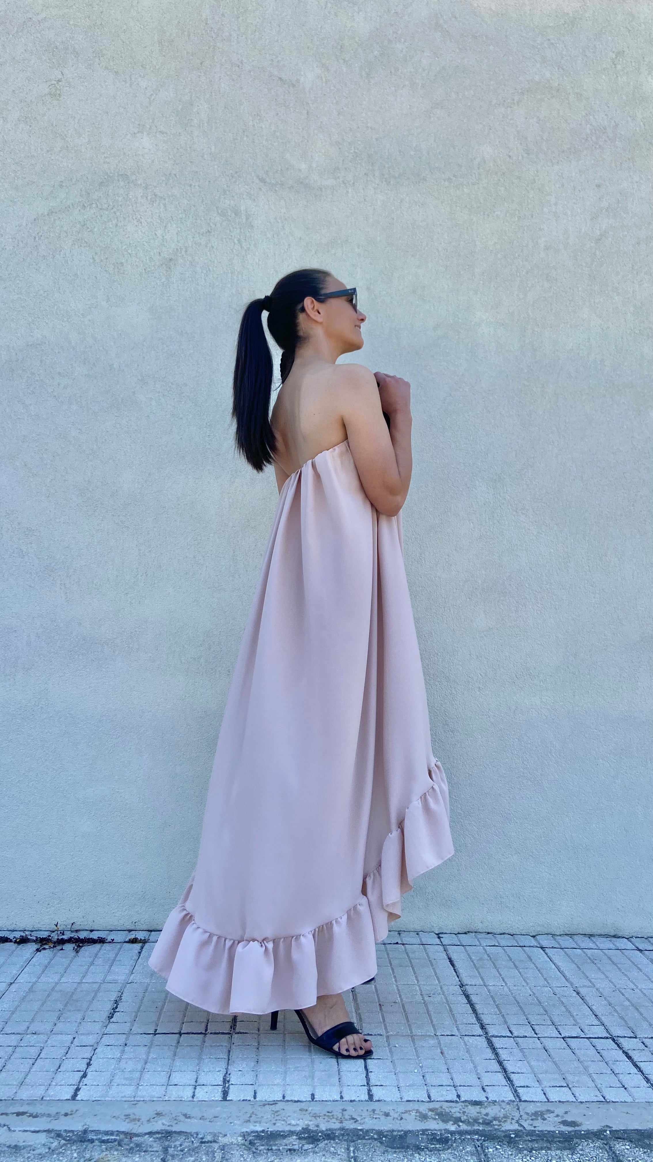 ABITO ASIMMETRICO CON FASCIA ELASTICA PIU' LUNGO DIETRO  VESTIBILITA' REGOLARE  MIS UNICA  COLORE CIPRIA  TESSUTO VISCOSA MIS ABITO SENO 35 CM STENDE 45 CM LUNGHEZZA DAVANTI 65CM DIETRO 104 LARGHEZZA...