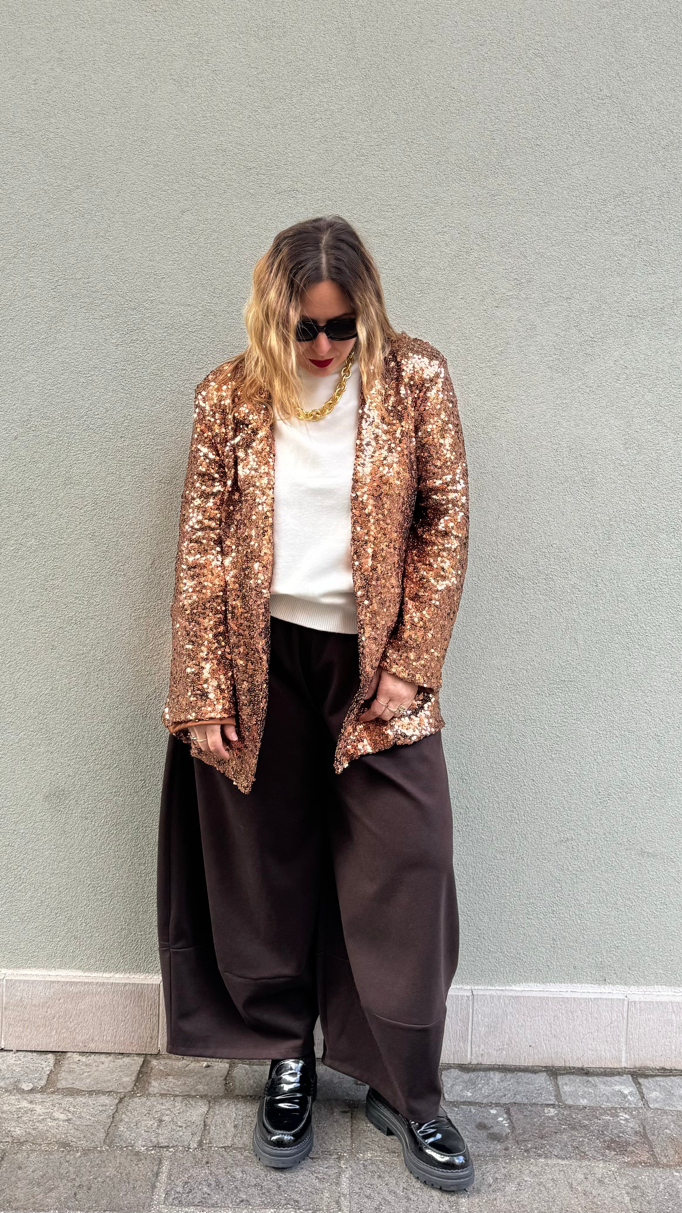 GIACCA IN PAILLETTES  FODERATO ALL'INTERNO  COLORE BRONZO  SPALLINE ALL'INTERNO MODELLO OVER  VESTE FINO ALLZA 48 MODELLA VESTE UNA 42 ALTA 1,68 NUOVI ARRIVI