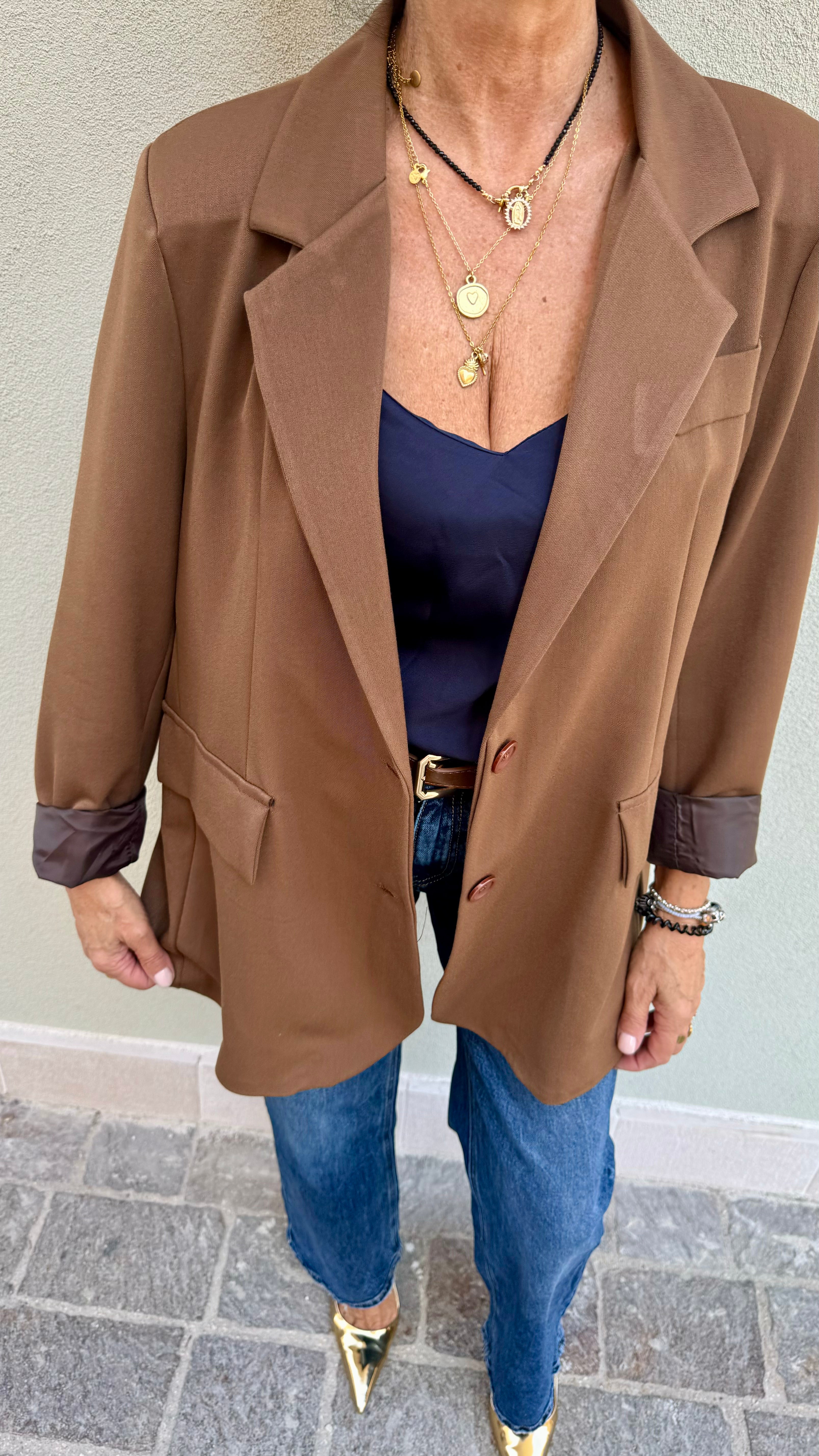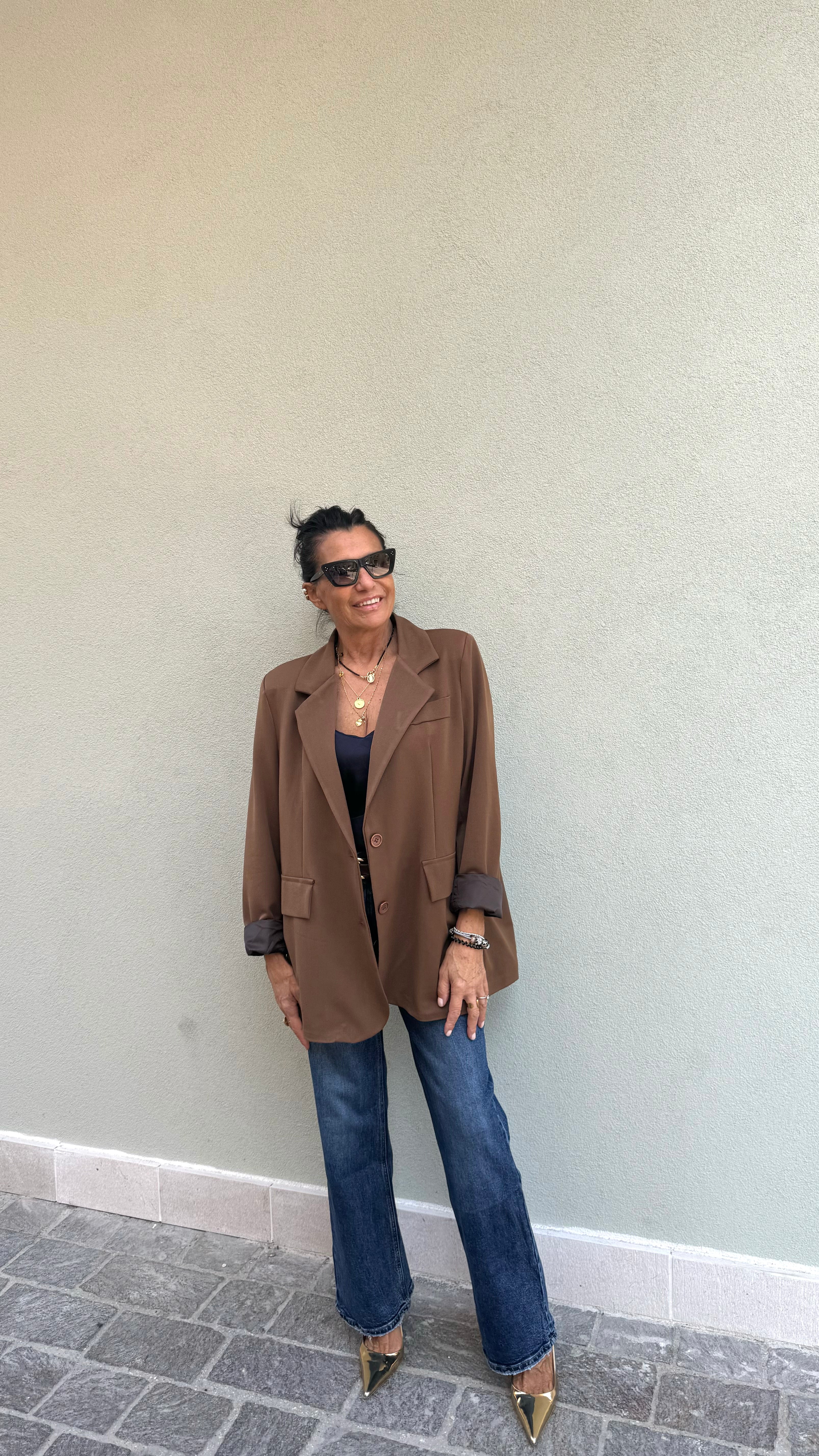 BLAZER OVER  FODERATO ALL INTERNO  MIS UNICA  CON SPALLINE  VESTIBILITA' OVER  MODELLA IN FOTO VESTE UNA 42 LA GIACCA VESTEFINO AD UNA 50  LUNGA 75 CM CHIUSURA CON DOPPIO BOTTONE ...