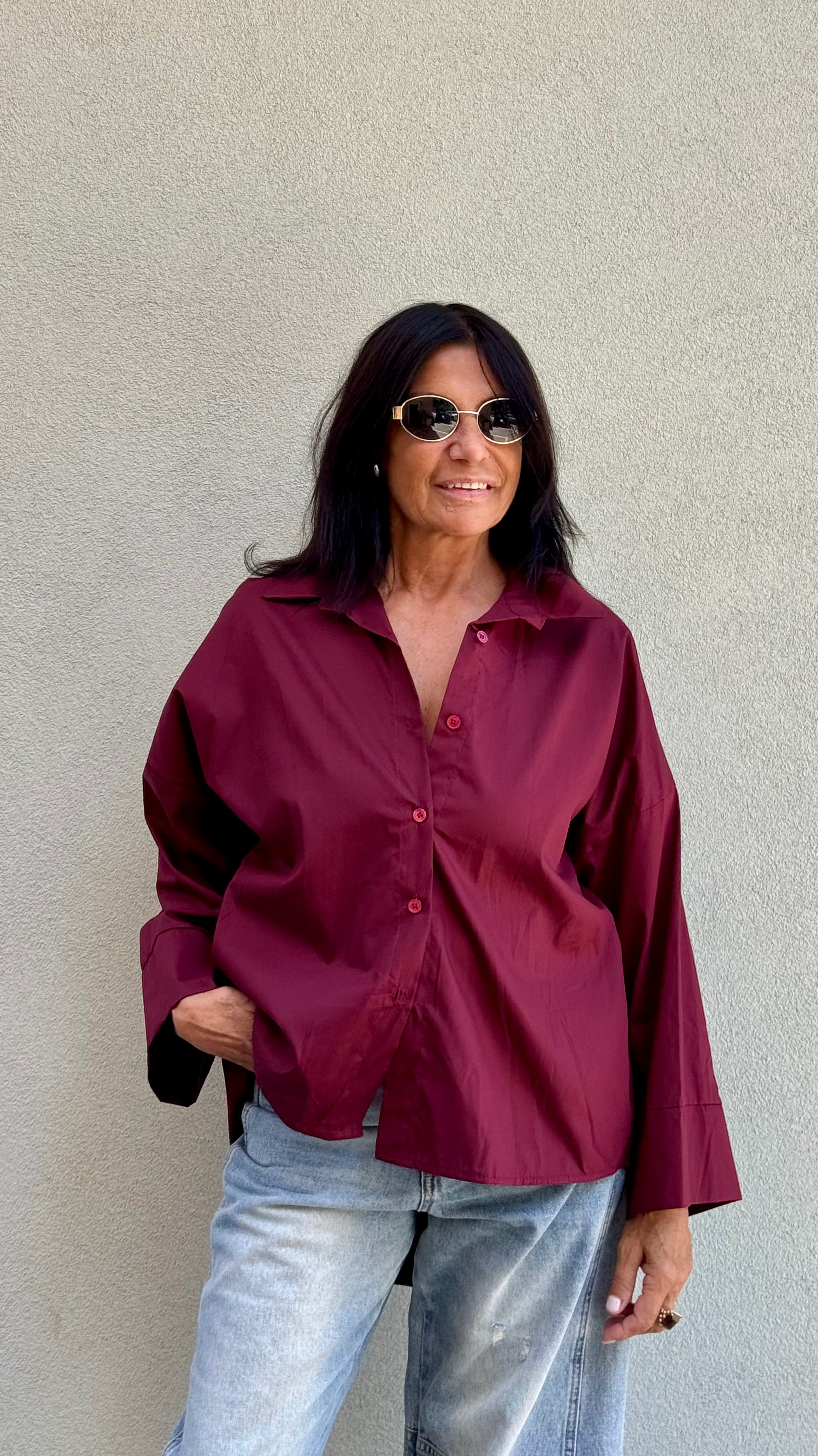 CAMICIA IN COTONE  MANICA LUNGA AMPIA  MODELLO LEGGERMENTE PIU' LUNGO DIETRO  MODELLO AMPIO  TESSUTO COTONE  ALLACCIATURA CON BOTTONI FRONTALI  VESTE DALLA 40 ALLA 48 MIS LUNGHEZZA DAVANTI.    LUNGHEZZA DIETRO ...