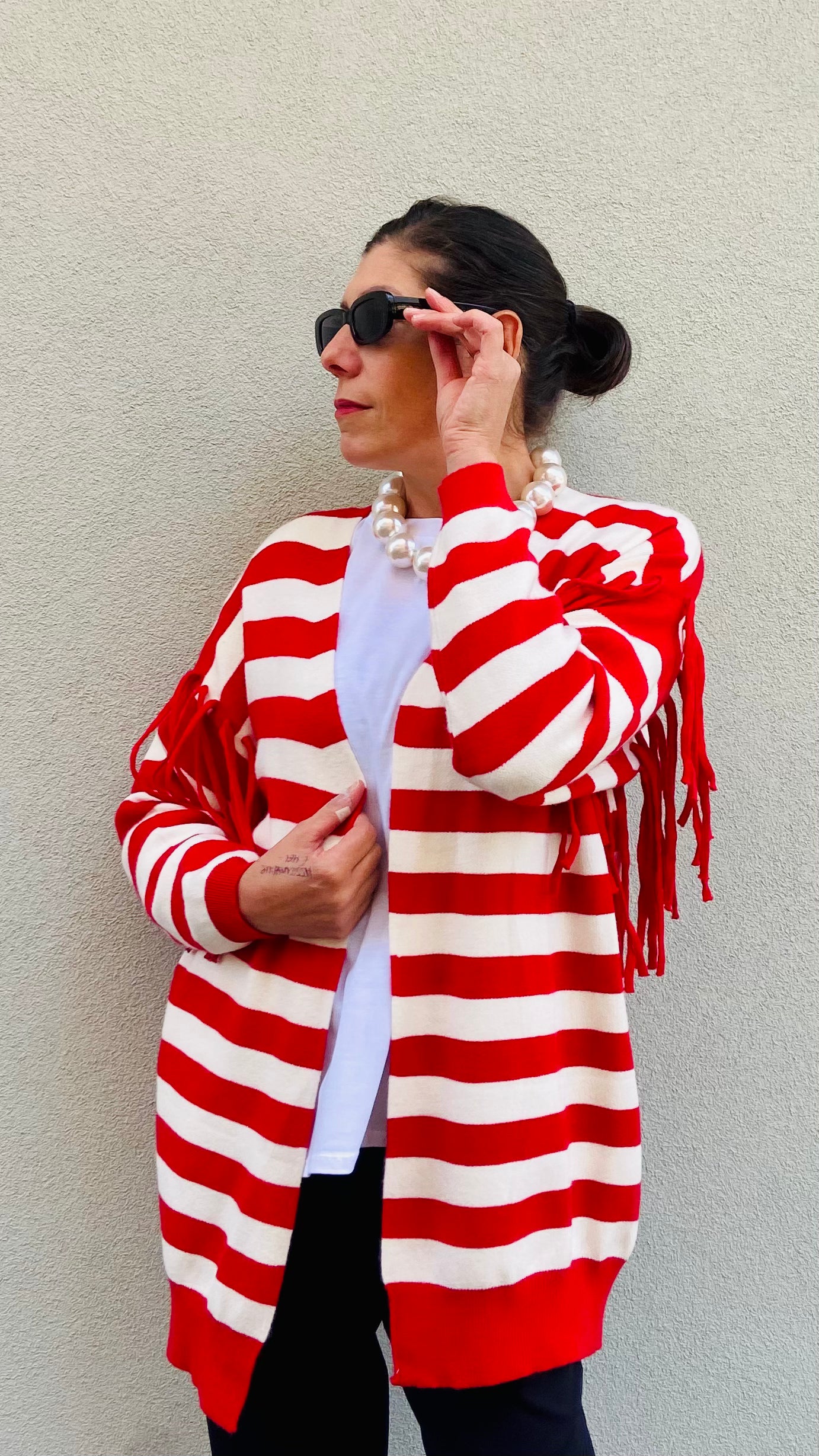 CARIGAN FRANGIA  COLORE PANNA RIGA ROSSA  DETTAGLIO FRANGE SULLE MANICHE  MIS UNICA  VESTIBILITA' COMODA  LUNGHEZZA 75 CM MODELLA IN FOTO VESTECUNA 42 NUOVI ARRIVI