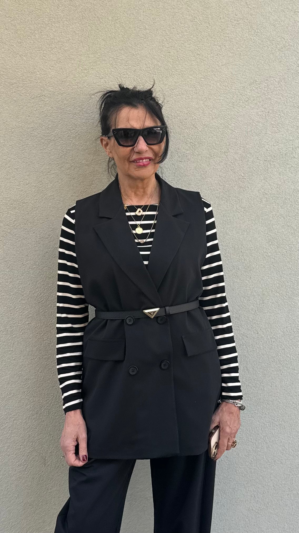 GILET DOPPIOPETTO  MODELLO OVER  TAGLIA UNICA  TESSUTO POLIESTERE E ELASTENE COLORE BLU   LUNGHEZZA  76 CM  VESTE DALLA 40 ALLA 50 MODELLA ALTA 1,68 VESTE UNA TAGLIA 42  NUOVI ARRIVI
