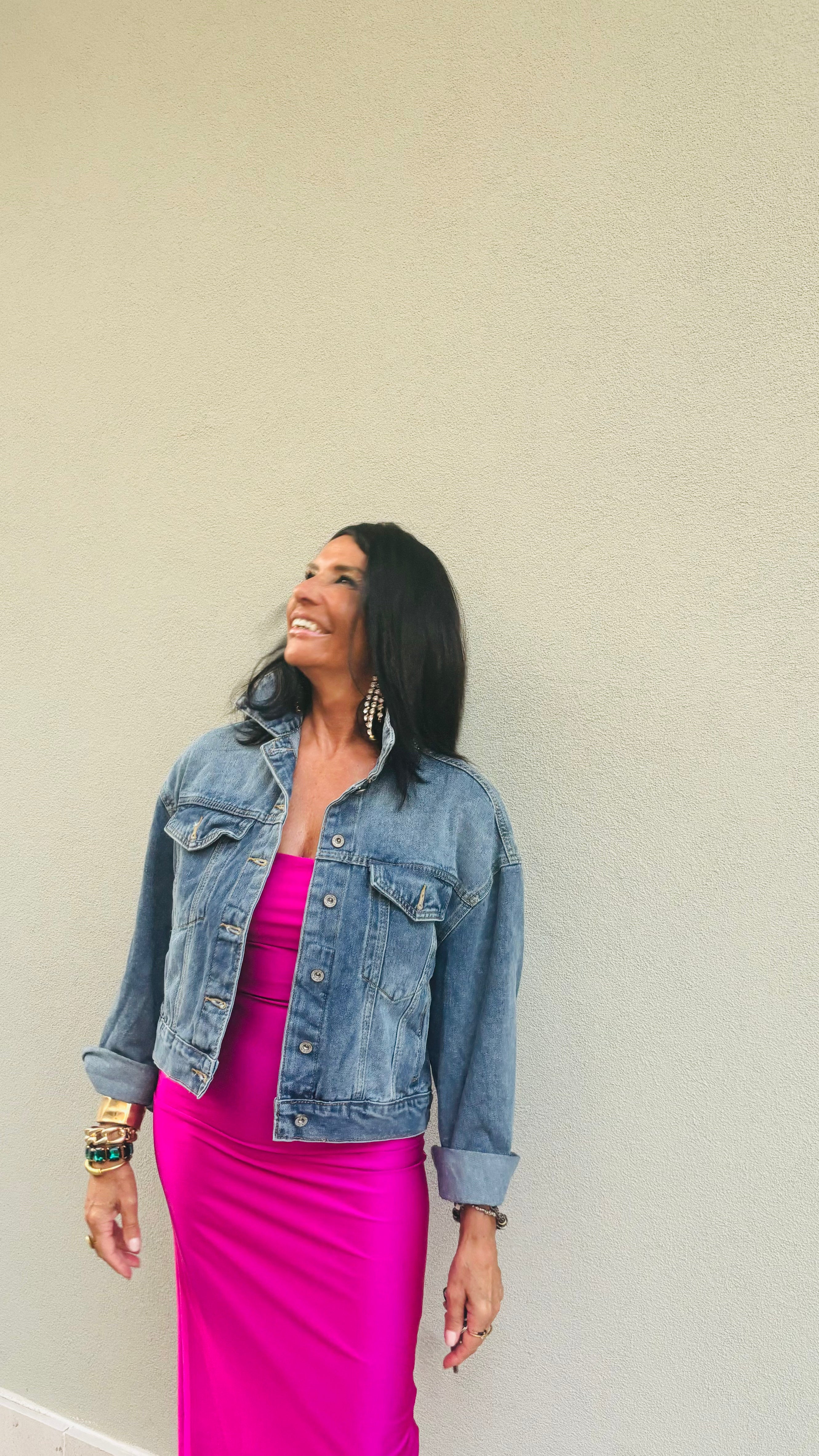 GIUBBINO IN JEANS COLORE BLU LAVAGGIO MEDIO  MANICHE LUNGHE  MIS UNICA  CHIUSURA CON BOTTONI  VESTIBILITA' NORMALE  MODELLO A SCATOLA  TASCHINI DAVANTI E TASCHE LATERALI MODELLO ELASTICIZZATO MIS SPALLE CM 52...