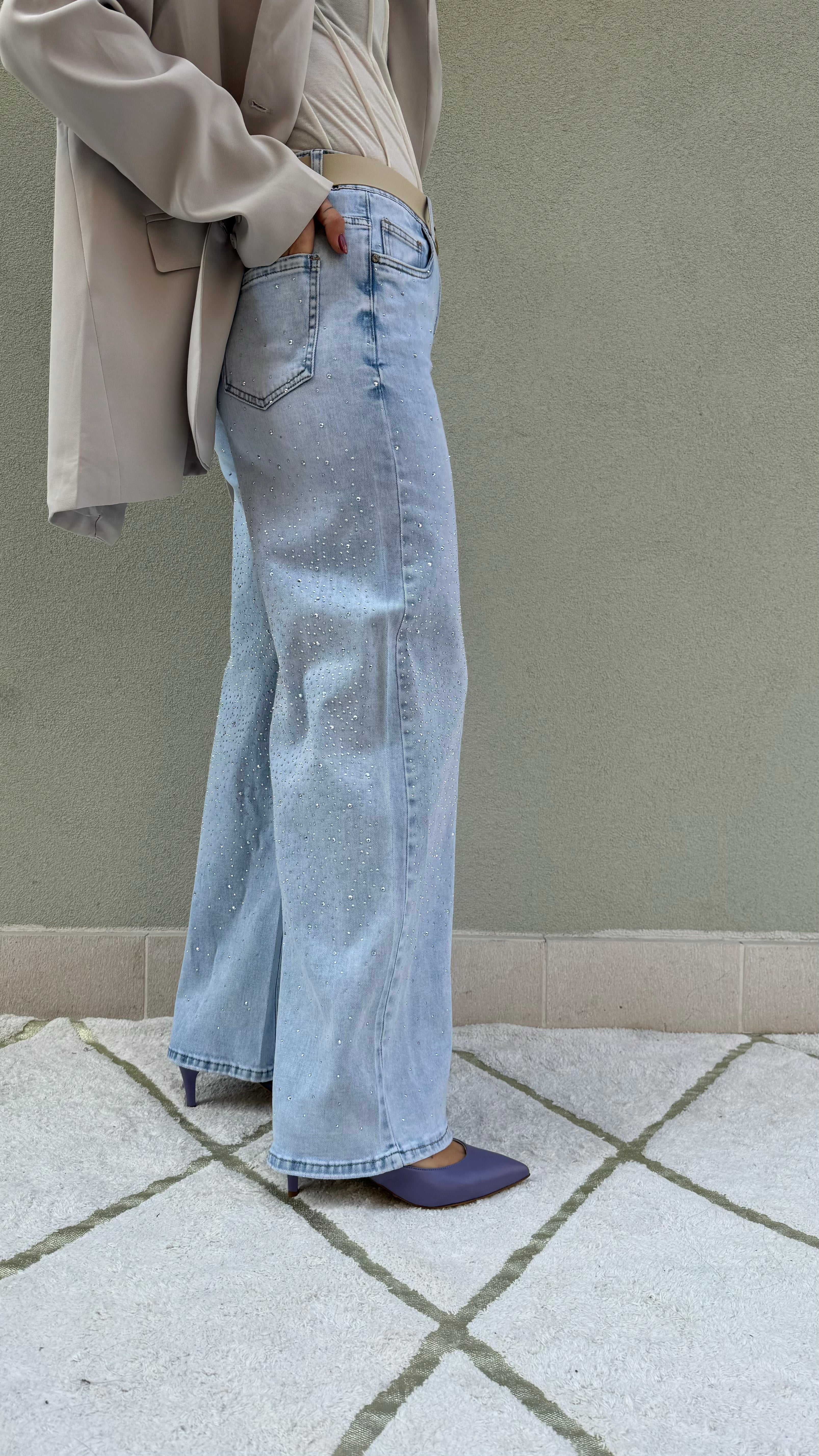JEANS A PALAZZO 5 TASCHE CHIUSURA CON ZIP E BOTTONE LAVAGGIO CHIARO MIS M LA MODELLA  IN FOTO VESTE UNA S E' ALTA 1,70 TESSUTO ELASTICIZZATO   APPLICAZIONE SUL DAVANTI CON...