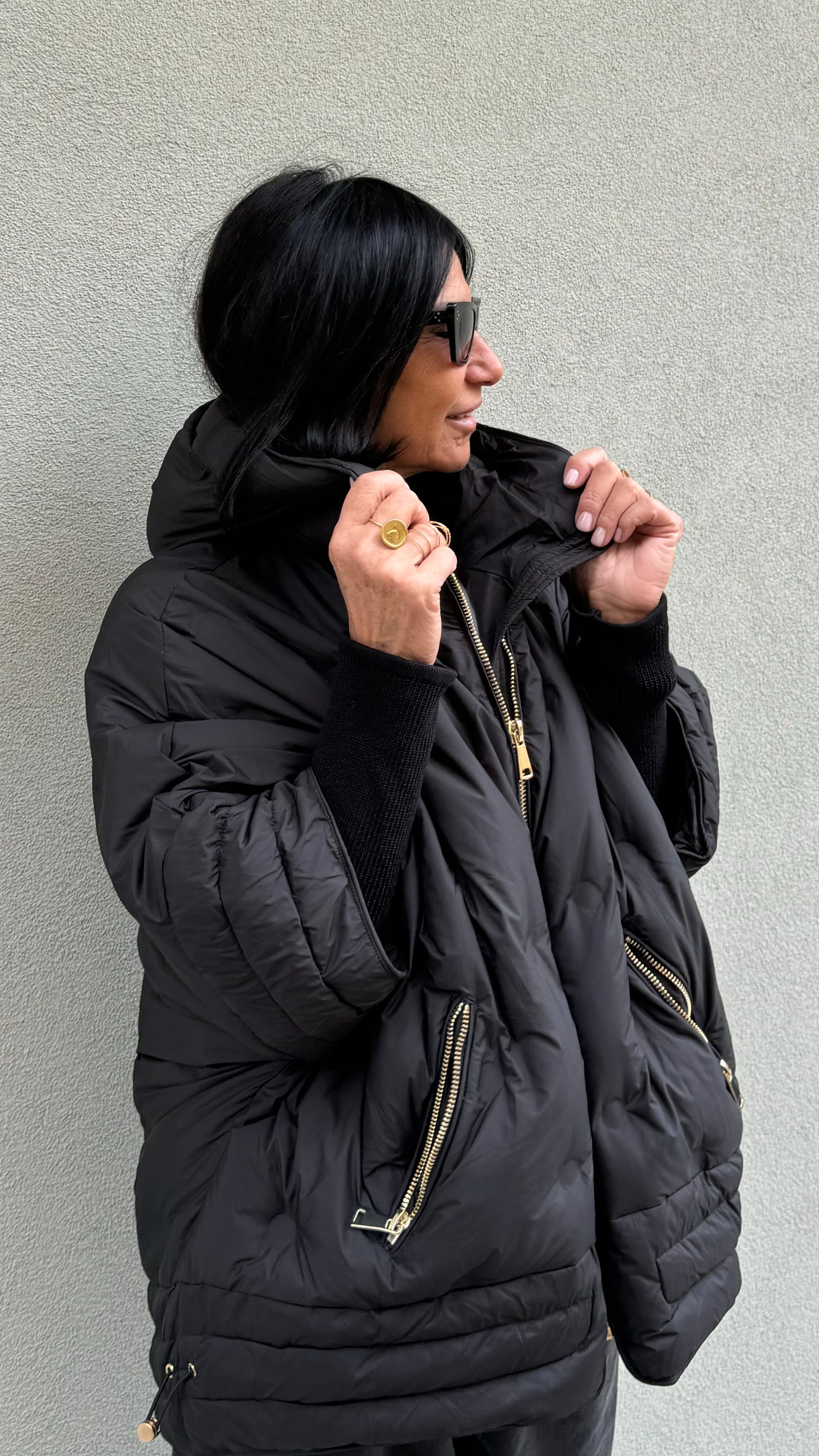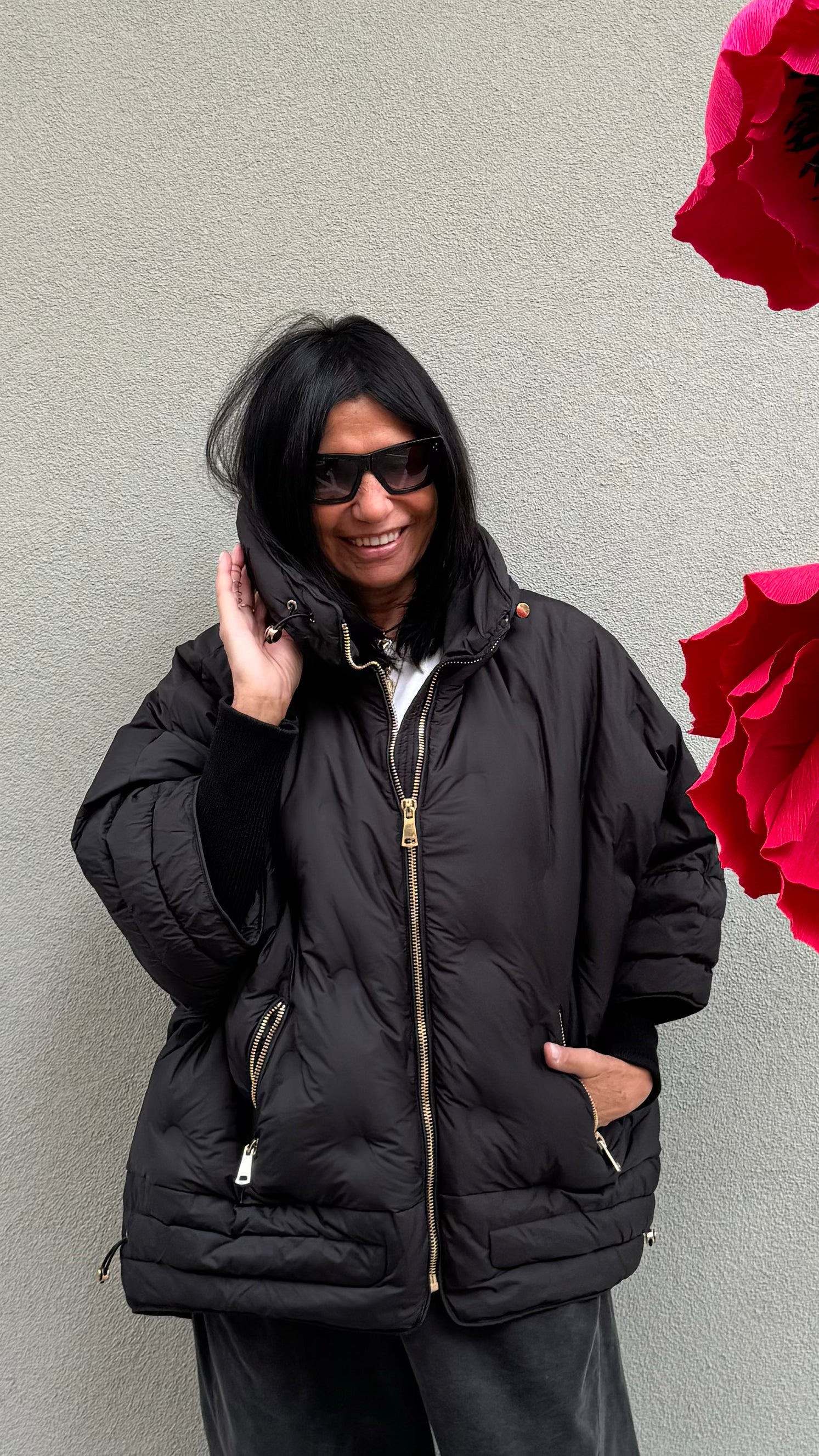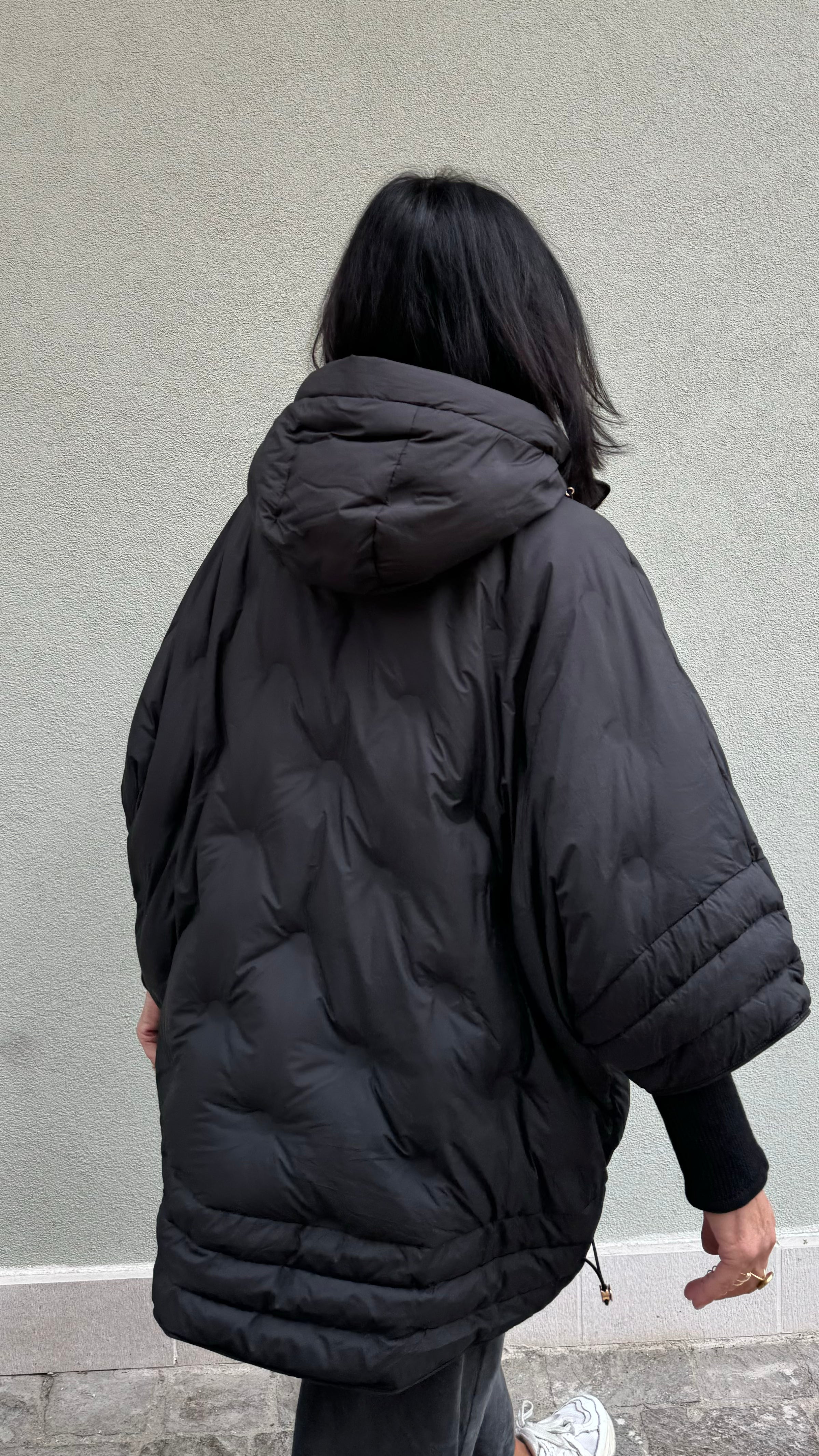 PONCHO IMBOTTITO  ALLACCIATURA CON ZIP  TASCHE LATERALI  CAPPUCCIO  MIS UNICA  MANICHE LUNGHE CON MANICOTTO  VESTIBILITA' AMPIA  LACCETTI LATERALI  MODELLA VESTE UNA 42 ALTA 1,69 INTERNOP IN PIUMA ECOLOGICA  FODERA 100%...