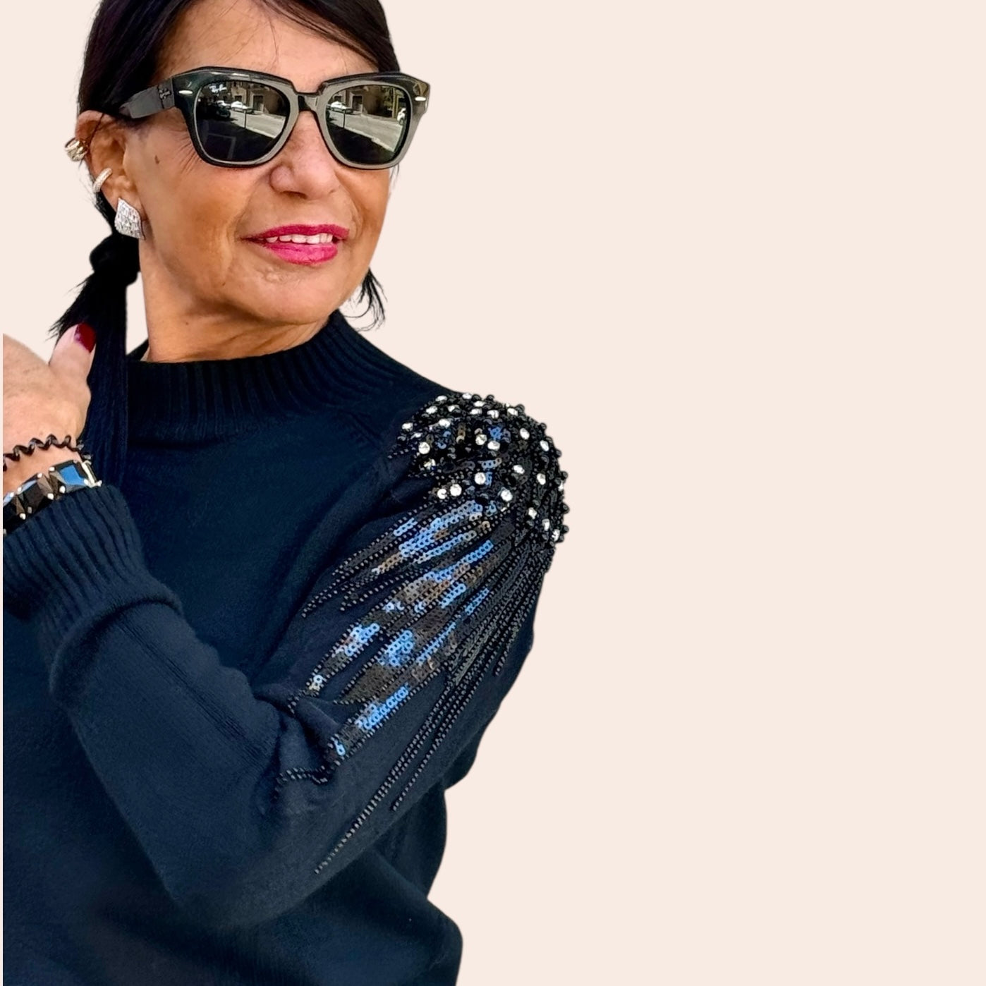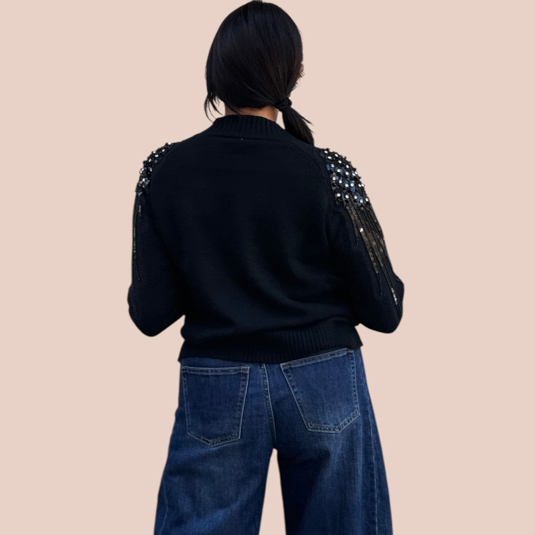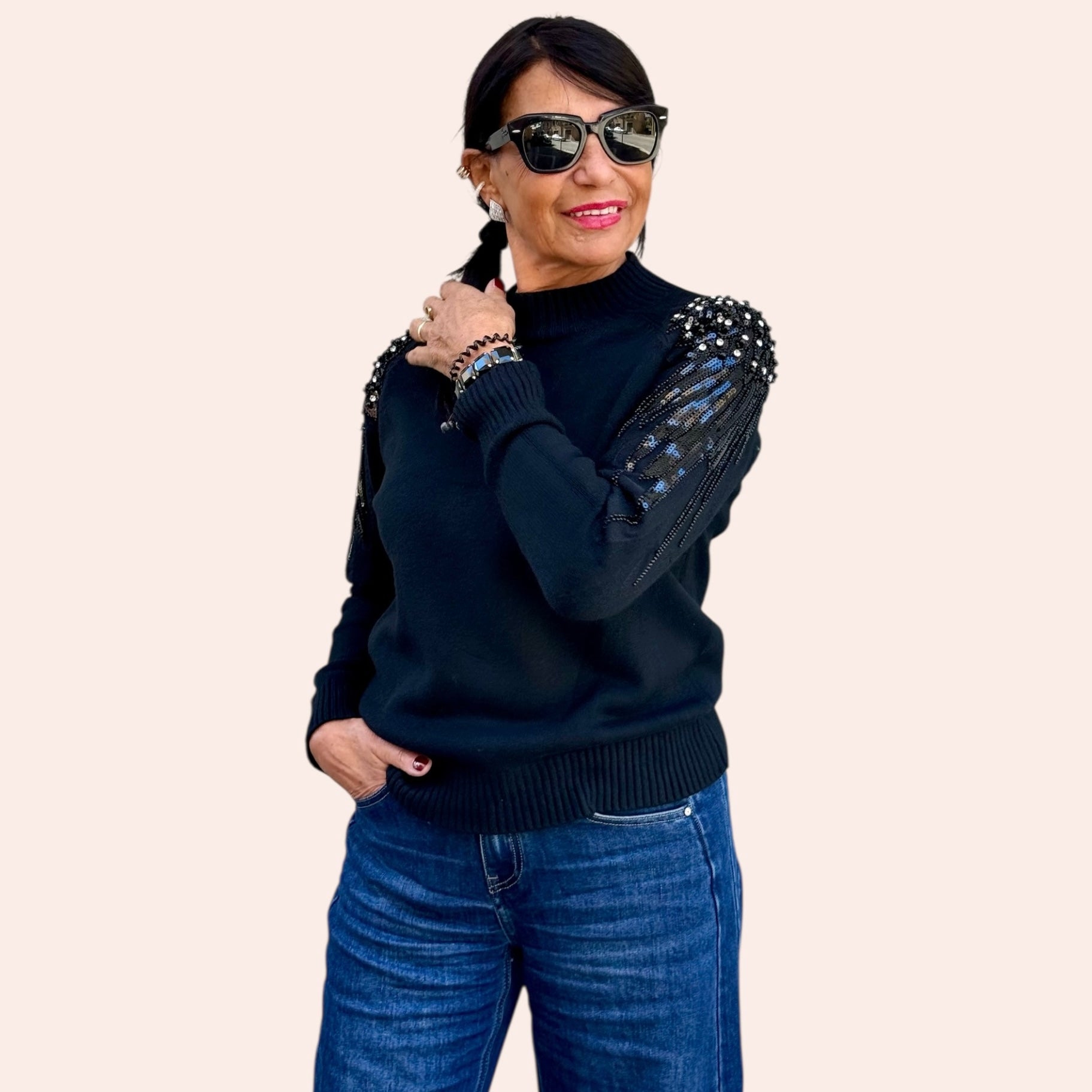 MAGLIA MEZZO COLLO  CON DETTAGLIO SULLE SPALLE IN STRASS PERLE E PAILLETTES MIS UNICA  TESSUTO MODAL VISCOSA ELASTENE VESTIBILITA' COMODA  CANNOLE' SULLE MANICHE E SUL COLLO  LA MODELLA VESTE UNA...