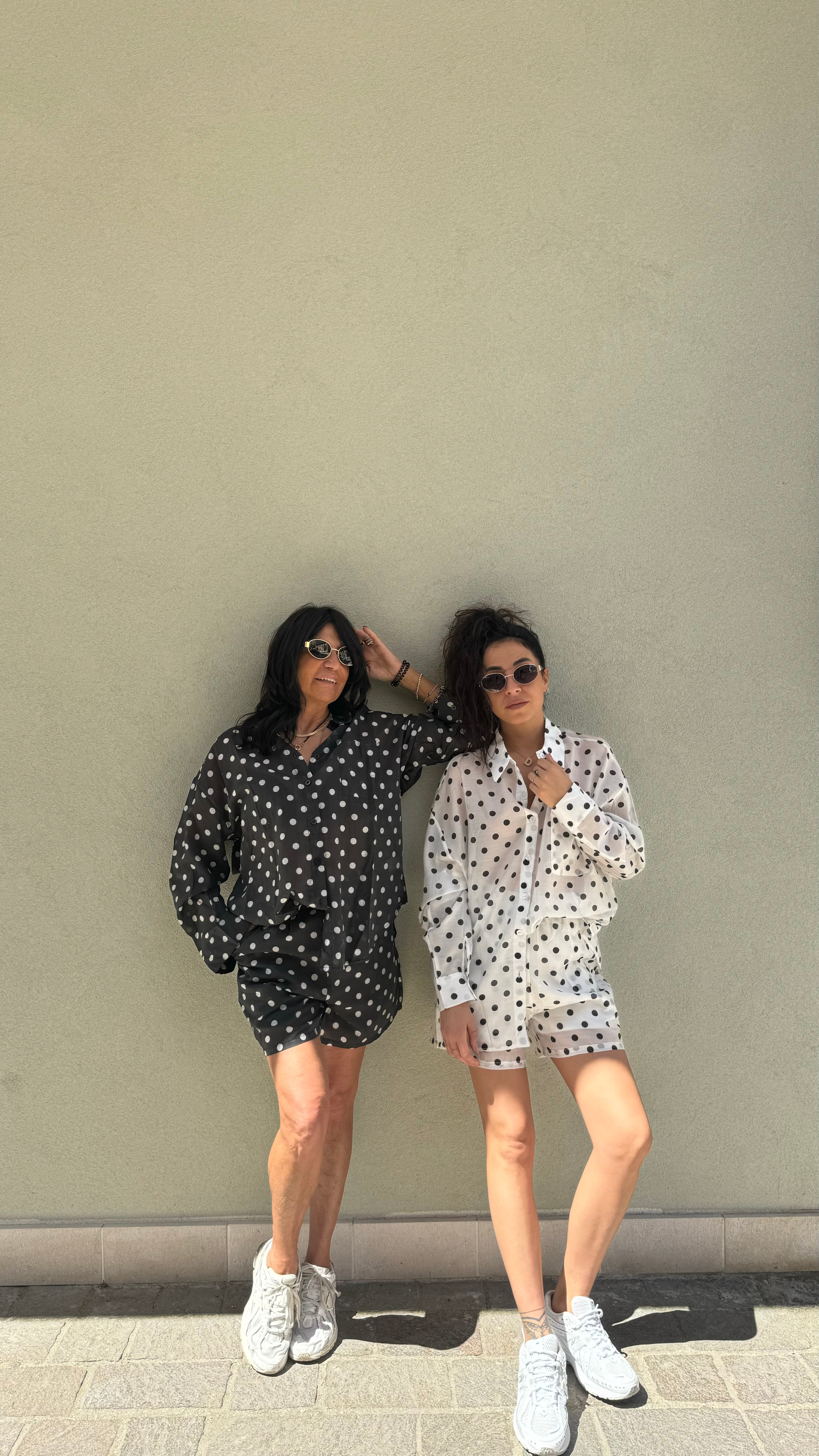 CAMICIA E SHORT  TESSUTO VISCOSA SEMI TRASPARENTE PER LA CAMICIA  FODERATO PER LO SHORT  BASE BIANCA POIS NERO MIS UNICA VESTIBILITA' CAMICIA AMPIA  VESTIBILITA' SHORT NORMALE  SHORT ELASTICO IN VITA...