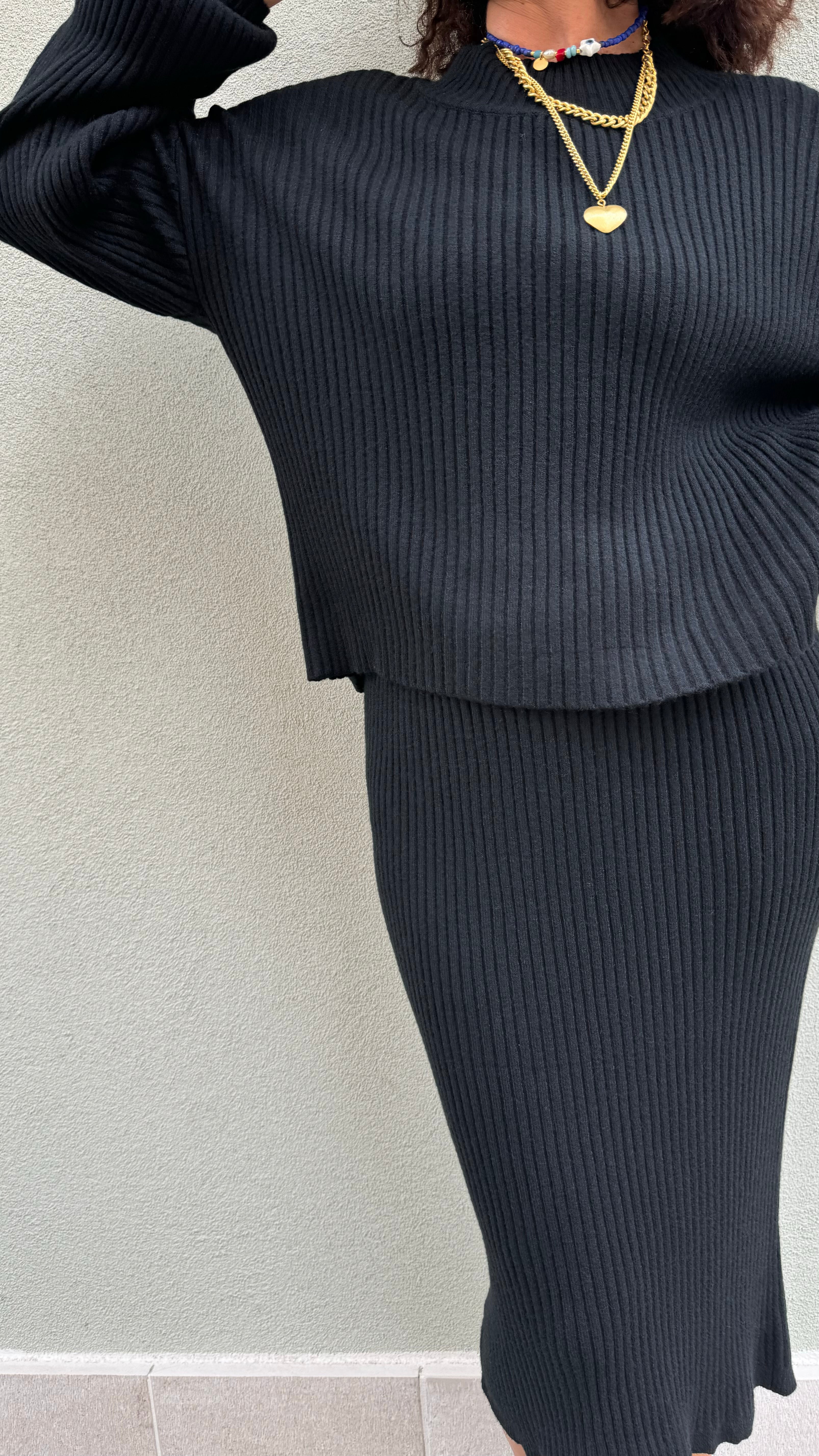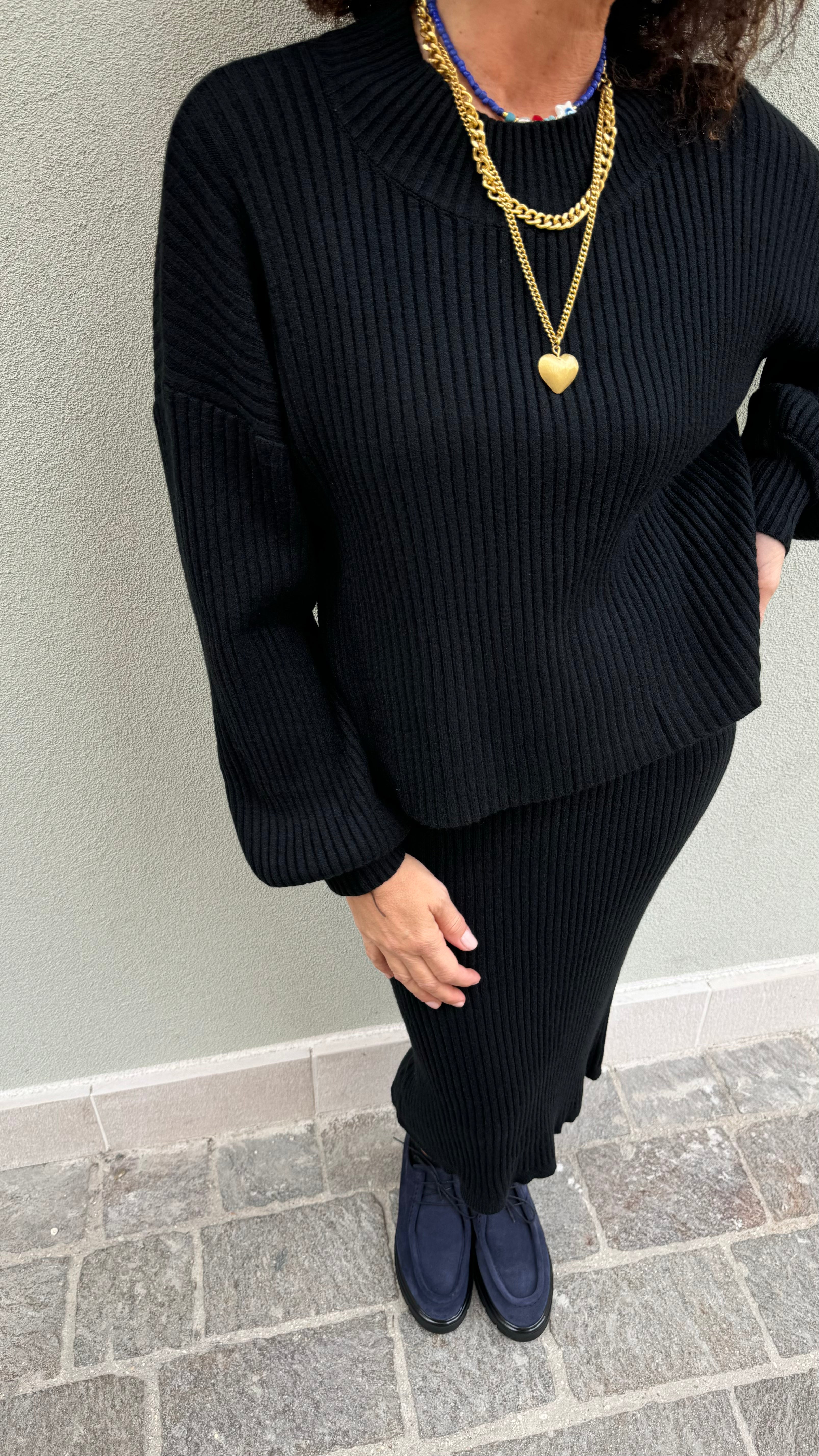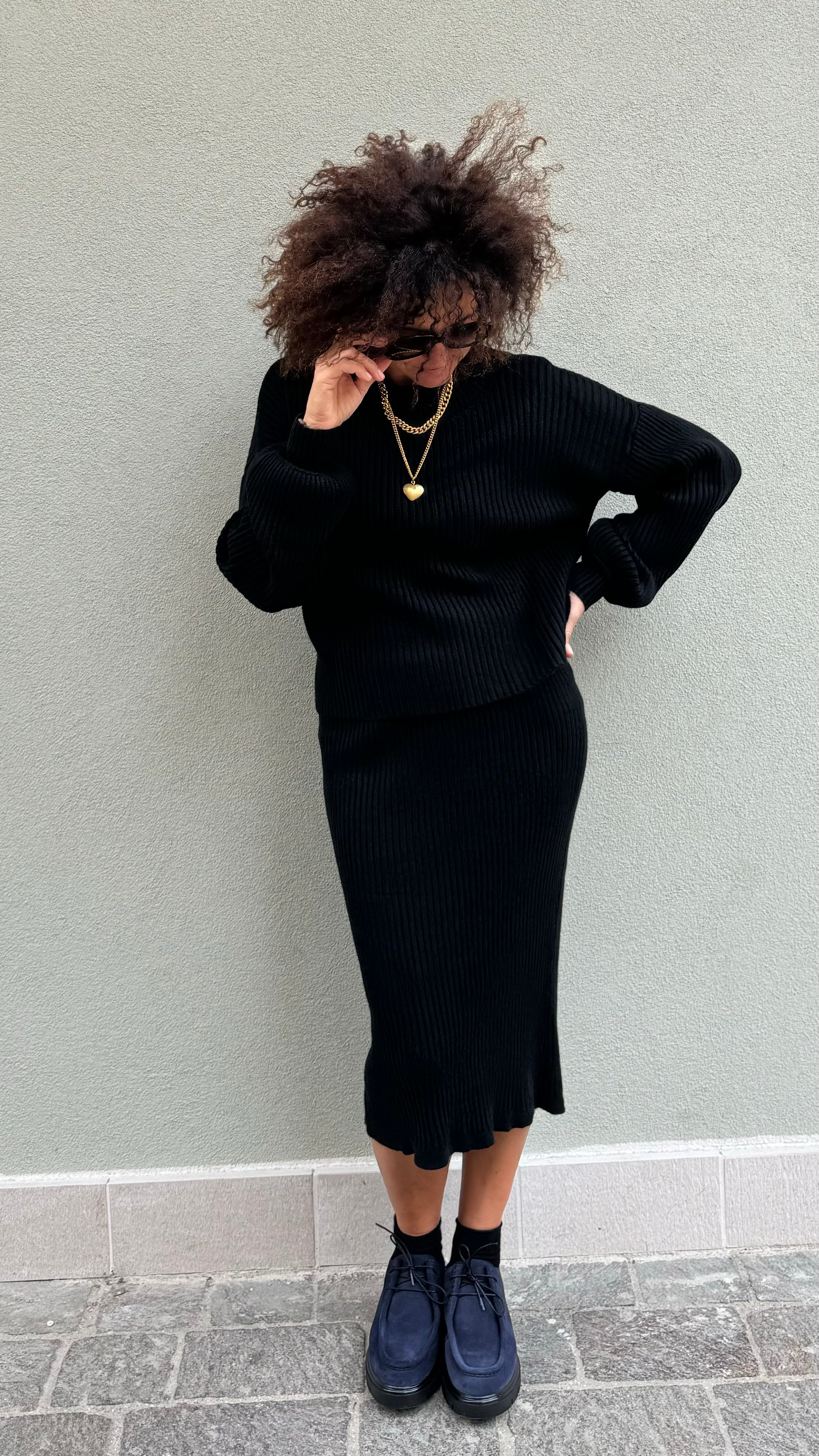 COMPLETO MAGLIA E GONNA  FANTASIA  A COSTE  TESSUTO VISCOSA POLIESTEREVELASTENE MAGLIA A GIROCOLLO CON MANICHE LEGGERMENTE AMPIE  GONNA LONGUETTE SOPRA AL GINOCCHIO CON ELASTICO IN VITA  MODELLA IN FOTO VESTE...
