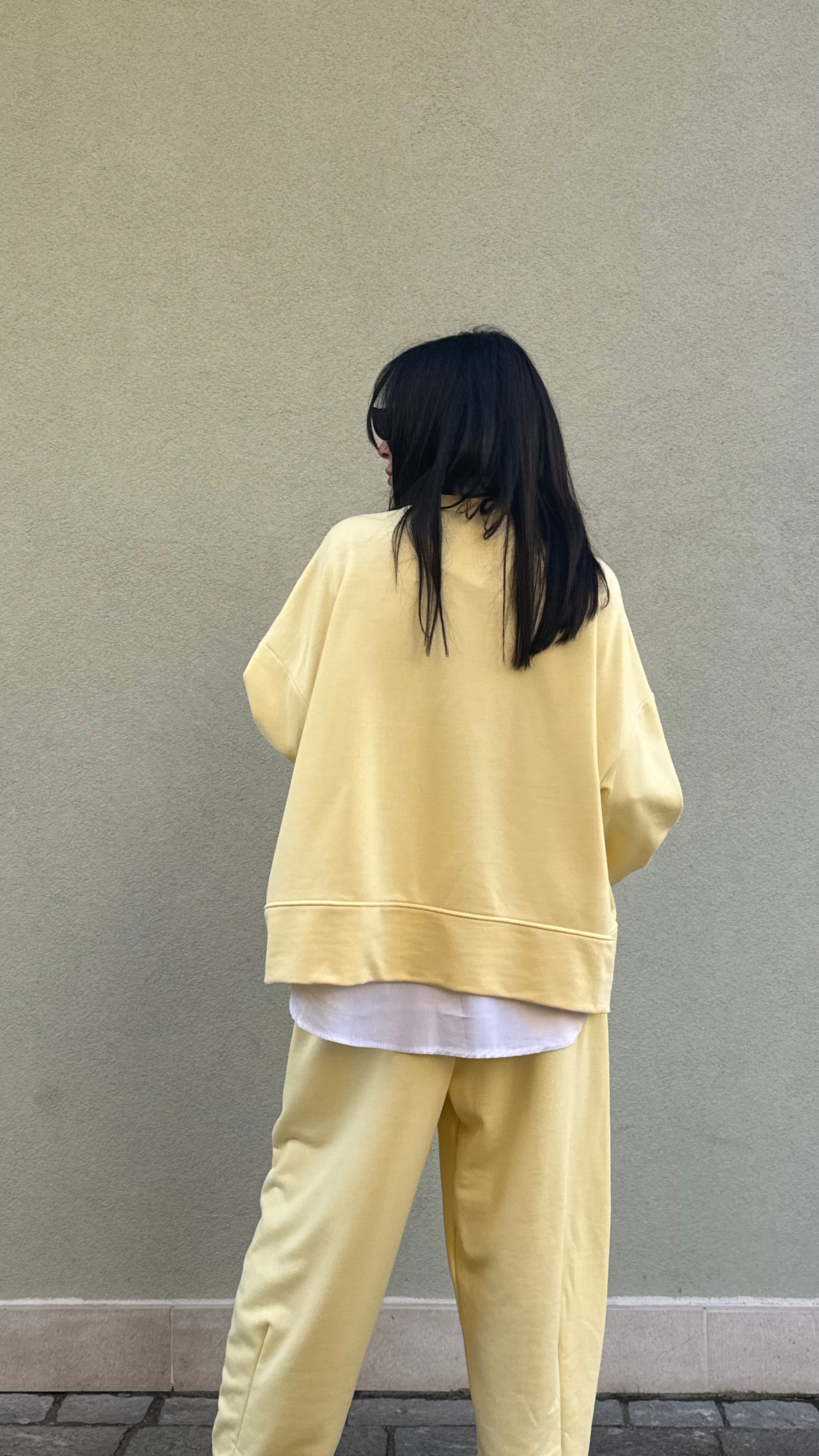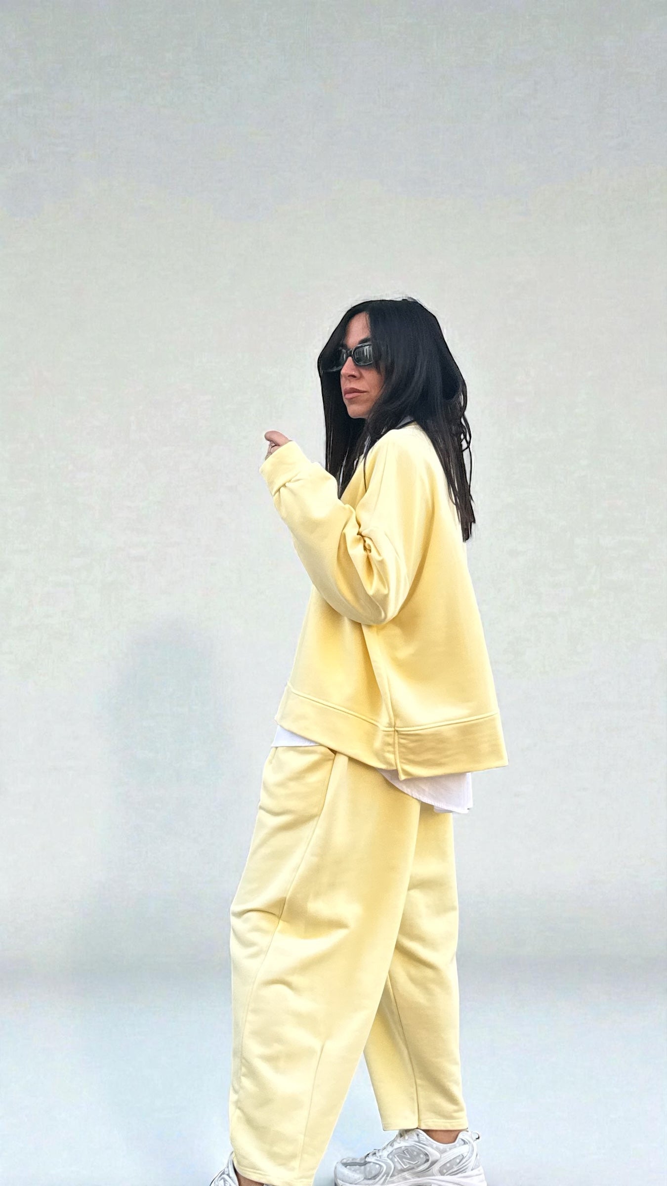 SET IN COTONE GARZATO  COMPOSTO DA MAGLIA  A GIROCOLLO  MODELLO AMPIO LEGGERMENTE PIU' LUNGA DIETRO  E PANTALONE AD OVETTO  MODELLO AMPIO CON  ELASTICO IN VITA E TASCHE LATERALI  MIS FELPA...