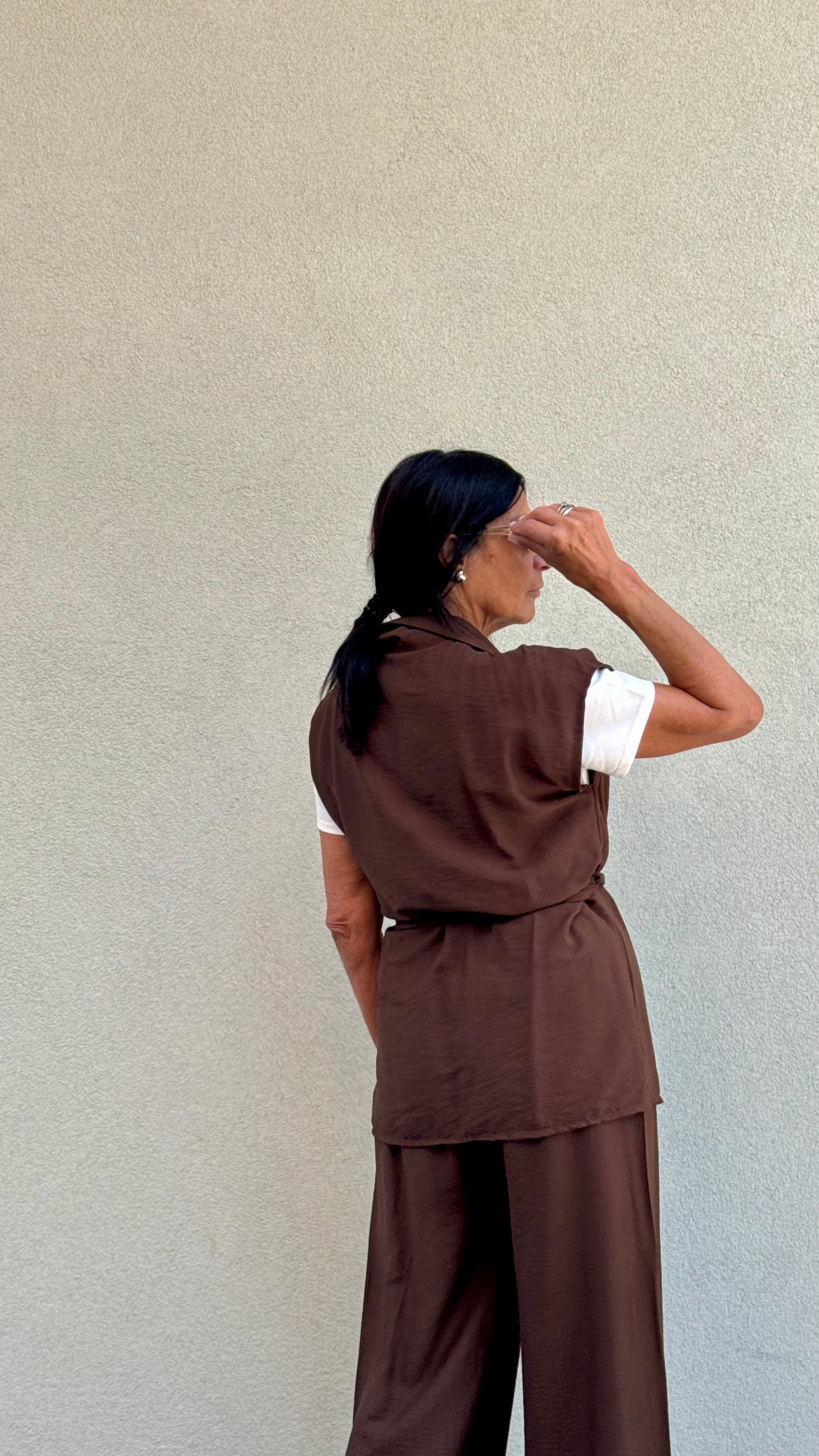 COMPLETO GILET E PANTALONE MIS UNICA GIACCA MANICA CORTA ALLACCIATA IN VITA CON CINTURA ESTRAIBILE  PANTALONE MORBIDO ELASTICO IN VITA MATERIALE VISCOSA POLIESTERE  VESTEC DALLA XS ALLA L  IN FOTO...