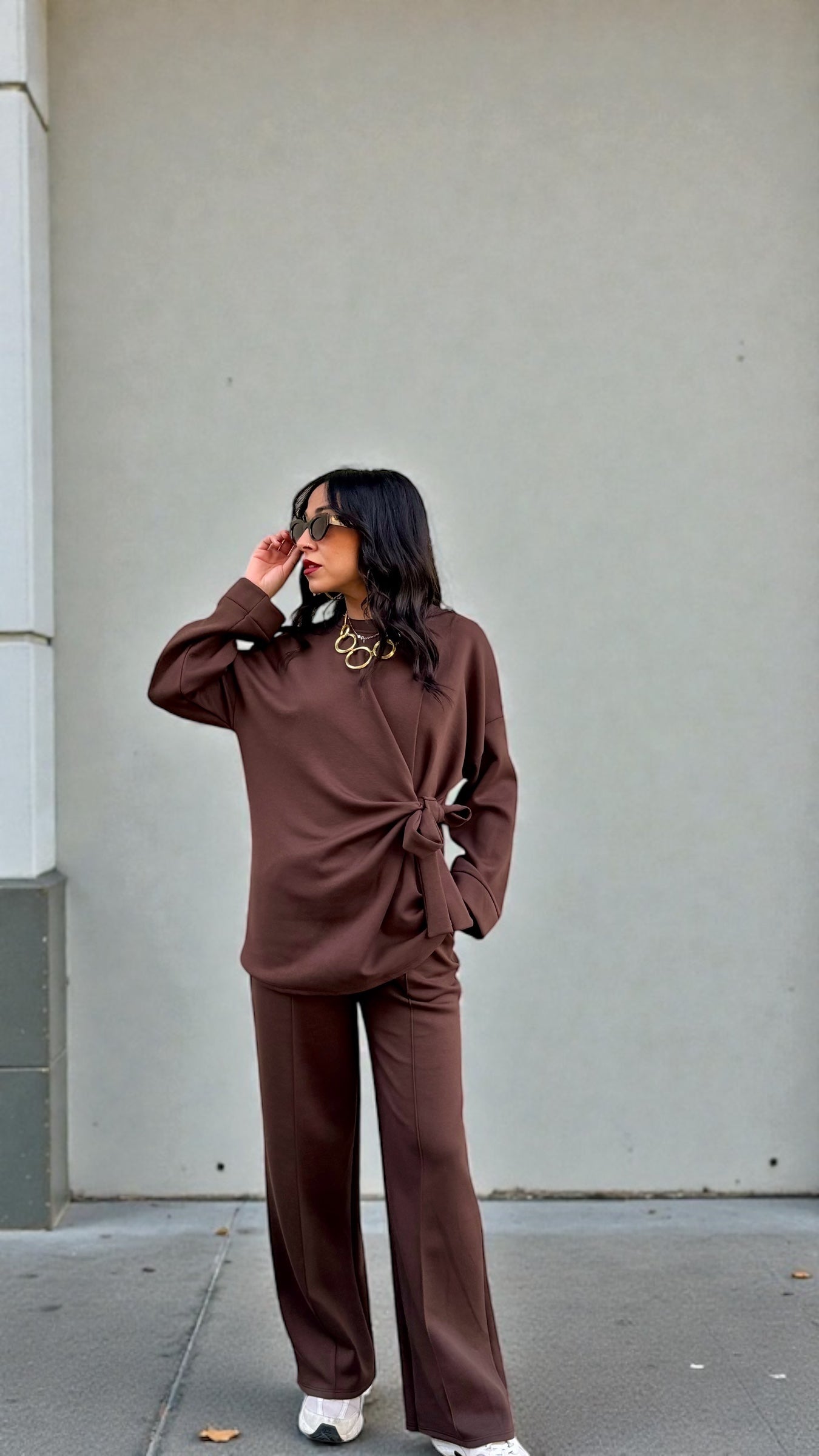 SET MATILDE  COMPOSTO DA FELPA A GIROCOLLO  CON FIOCCO LATERALE  E PANTALONE DRITTO CON CULISSE IN VITA MODELLA VESTE UNA 42 ALTA 1,70 MODELLO MORBIDO CHE VESTE FINO AD UNA...