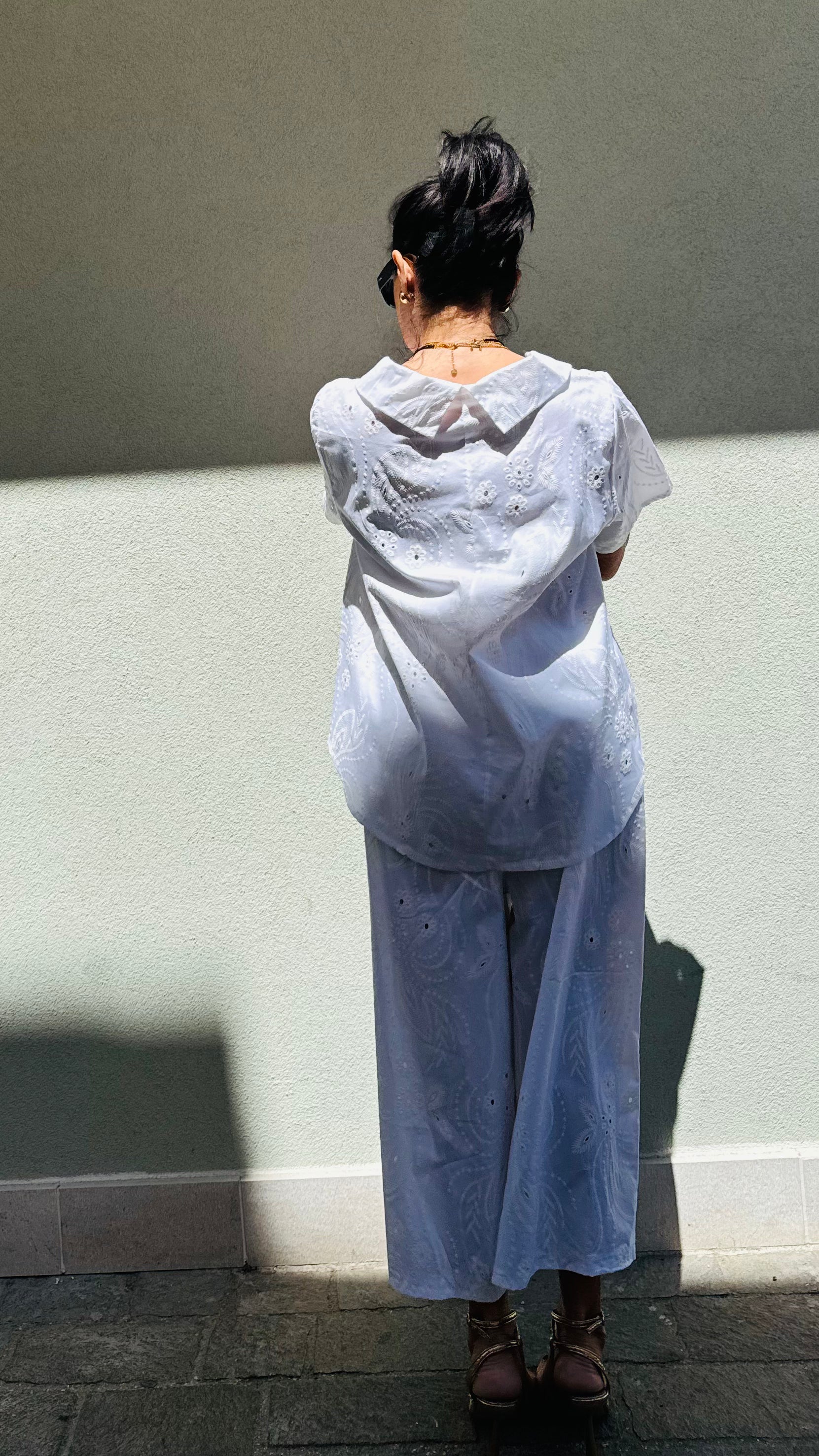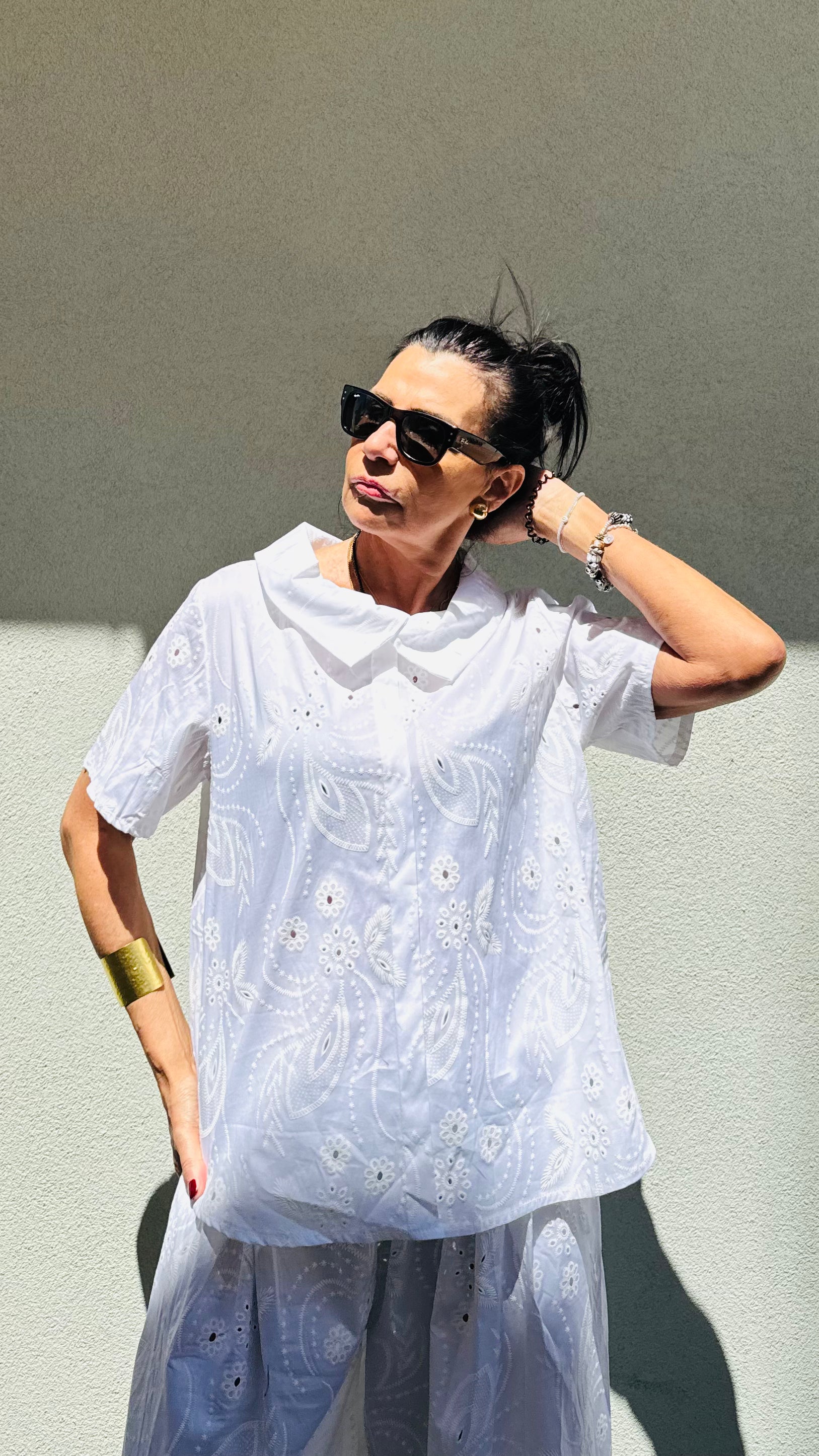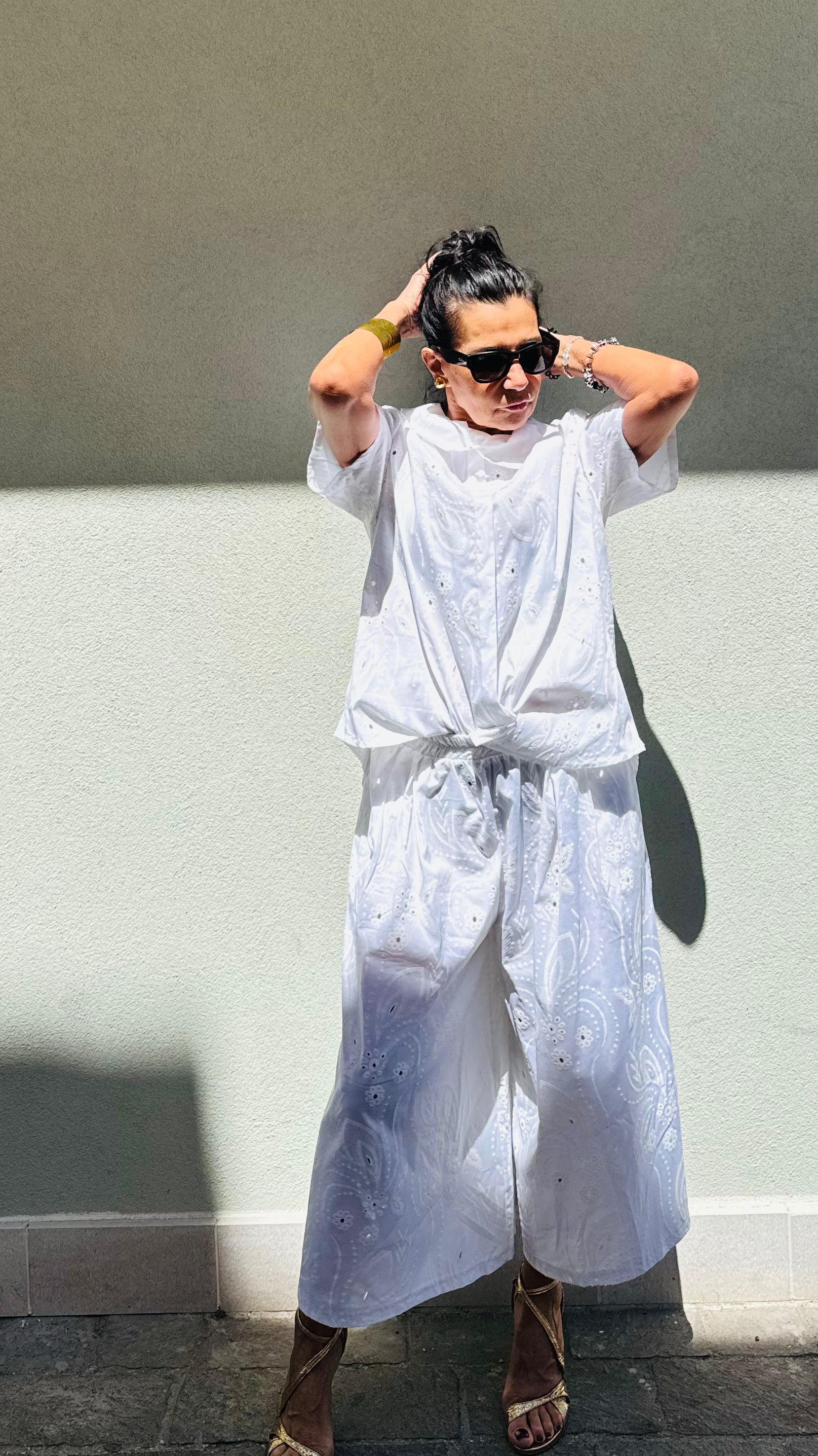 CAMICIA IN COTONE  IN SANGALLO MIS UNICA VESTIBILITA' AMPIA MANICA  CORTA  VESTE DALLA 42 ALLA 48 PANTALONE AMPIO CON ELASTICO IN VITA MODELLO CULOTTE TASCHE LATERALI MODELLA VESTE UNA 42...