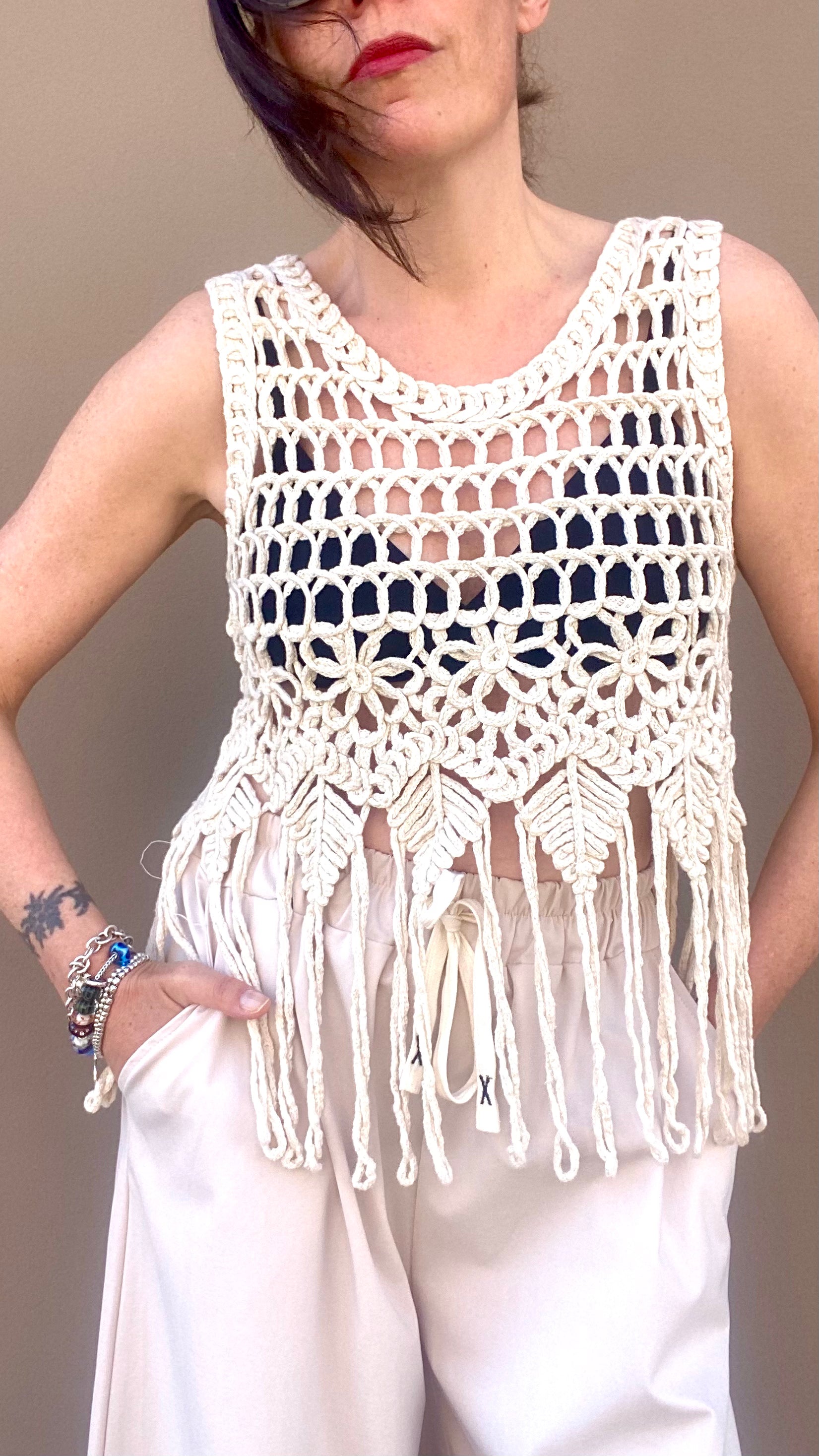 TOP UNCINETTO  COLORE CREMA  MIS UNICA FRANGE FINALI  TESSUTO COTONE E ELASTENE  MIS 40 CM LARGHEZZA 60 CM LUNGHEZZA COMPRESE FRANGE  NUOVI ARRIVI